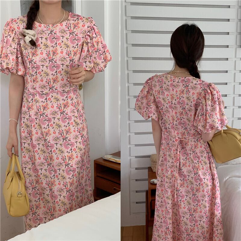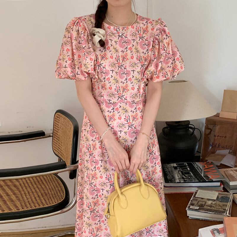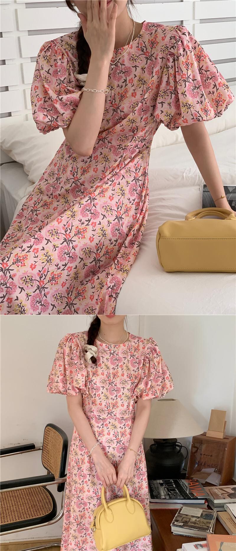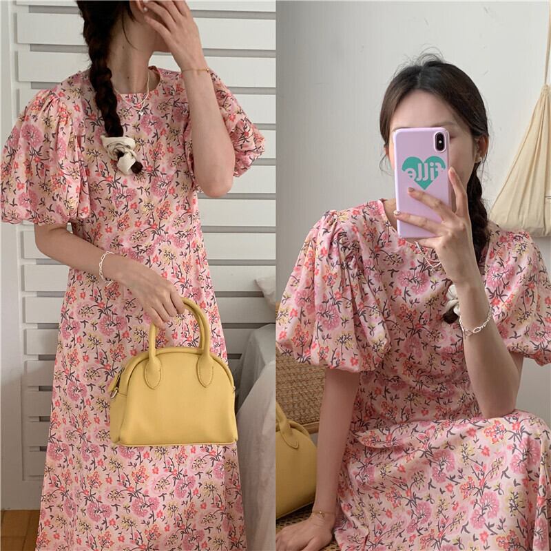 サマーラウンドネックFlowerデザイン ウェストスリムスリーブドレス ロングスカート ランタンスリーブ 大人ガーリー スウィート キュート カジュアル 夏物 Oネック フラワーデザイン 7/20 mi4660972135712