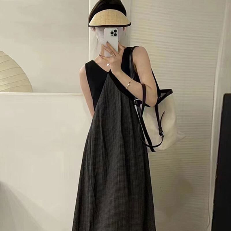 サマースタンダードVネックカラープリーツノースリーブドレス ロングスカート レトロ 夏物 ステッチ 7/20 mi4668976007475