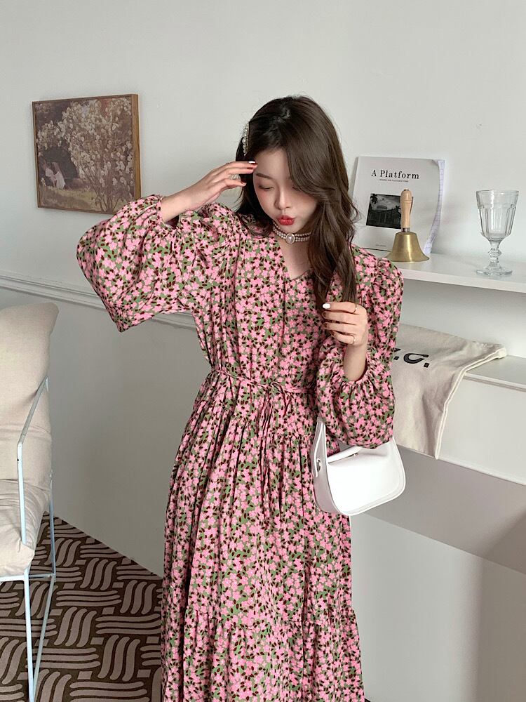 スプリングスタンダードVネックウェストスリムスリーブシフォンフローラルドレス レトロ 春物 花柄 7/20 mi4613100575698