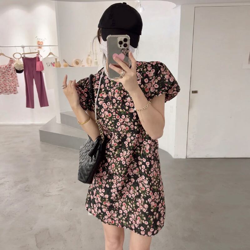 サマースタンダードラウンドネックウェストスリムスリーブドレス レトロ 夏物 Oネック フラワーデザイン 7/20 mi4642243333857