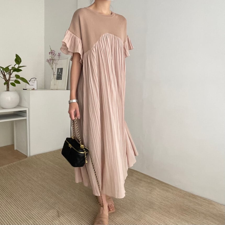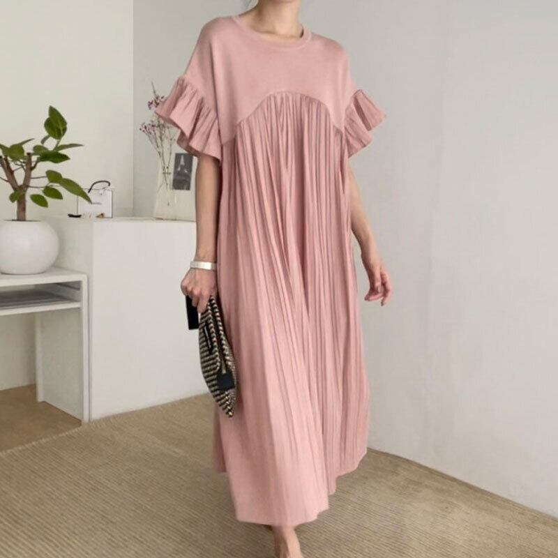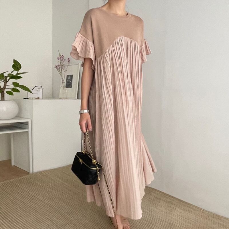 サマーラウンドネックプリーツスリーブドレス ロングスカート 夏物 Oネック ステッチ 7/20 mi4654458991268