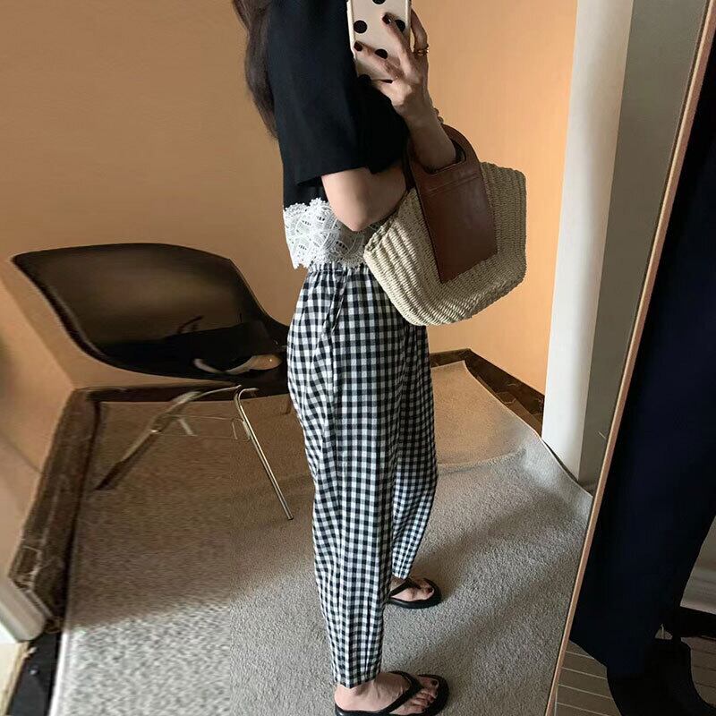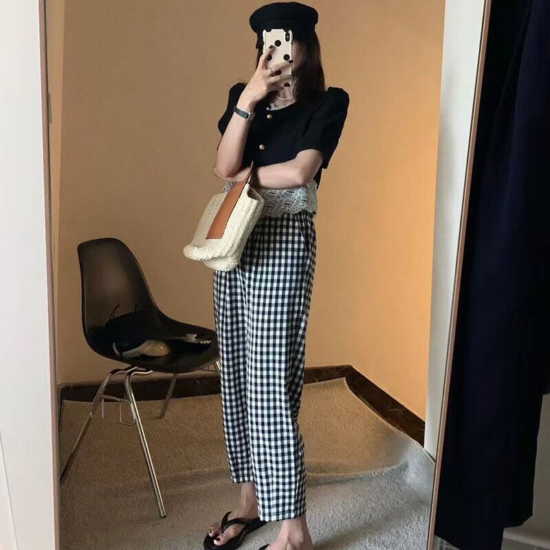 サマースタンダードラウンドネックレースシャツ ハイウェストウェスト格子柄カジュアルパンツ レディース レトロ 夏物 Oネック 7/20 mi4642293230376