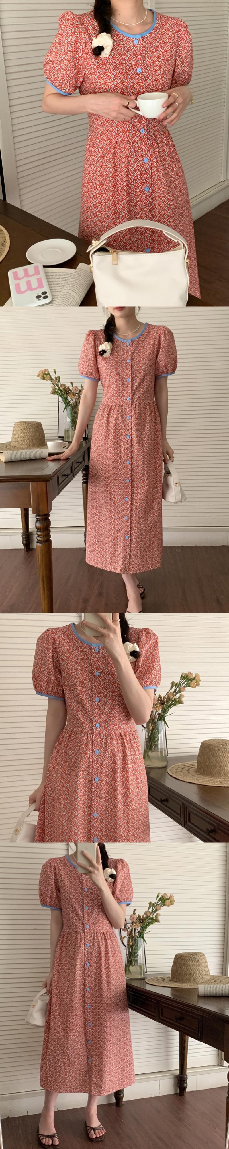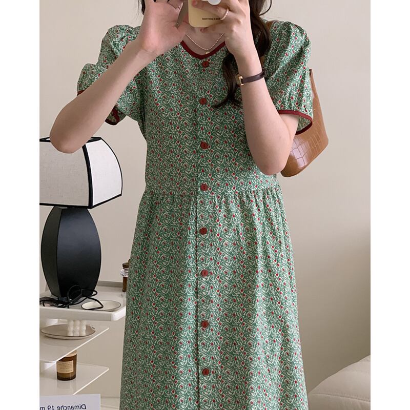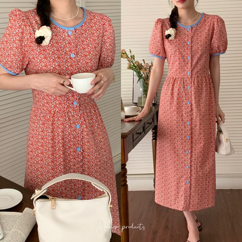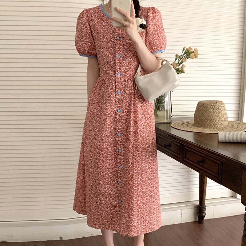 サマースタンダードラウンドネックカラーウェストスリーブフローラルドレス レトロ 夏物 花柄 Oネック 7/20 mi4629688466318