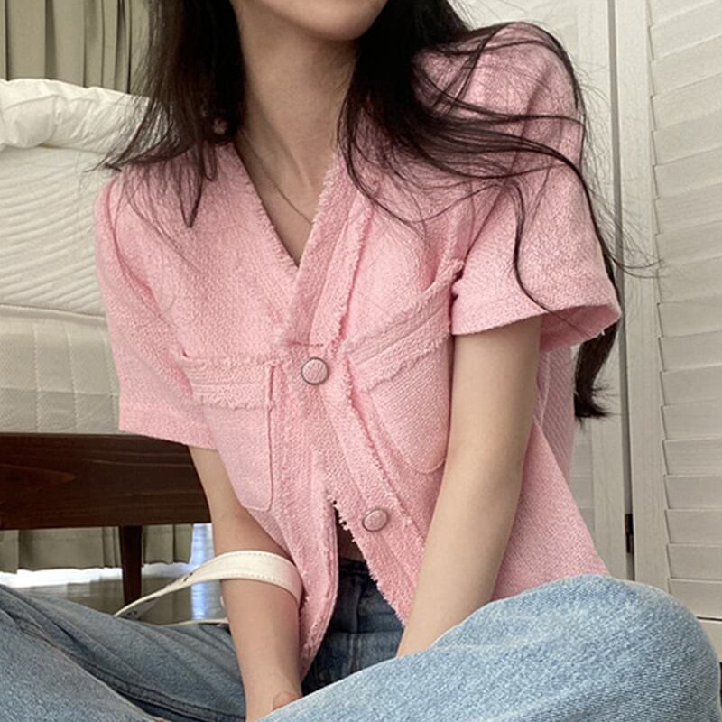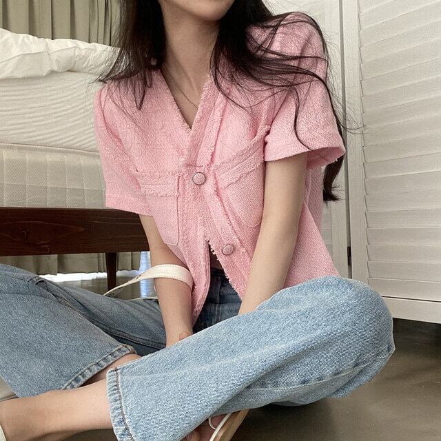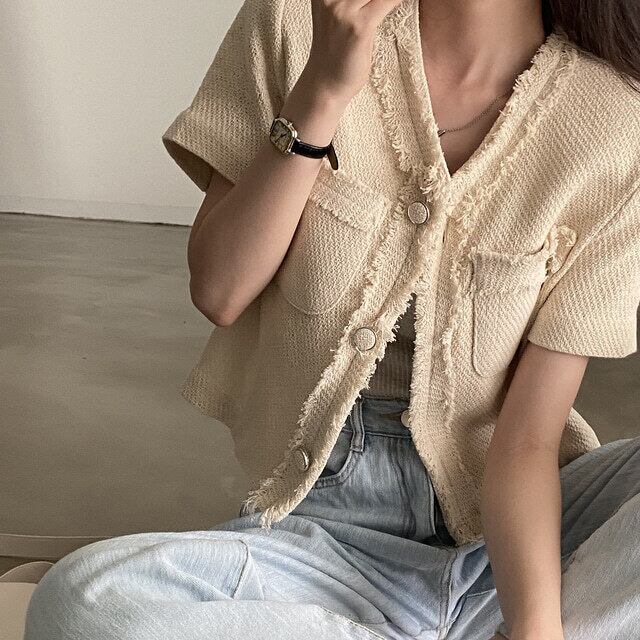 サマーVネックダブルポケットルーズツィードショートジャケット レディース 夏物 7/20 mi4691279547170