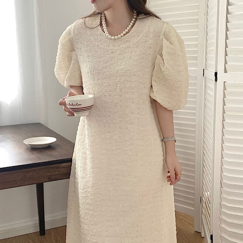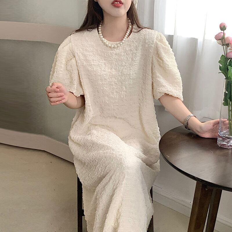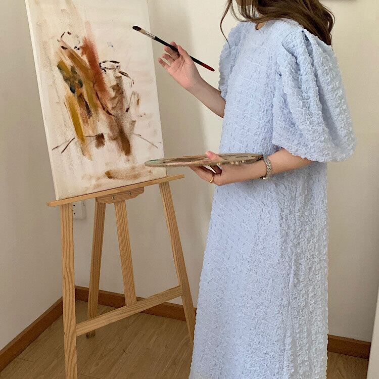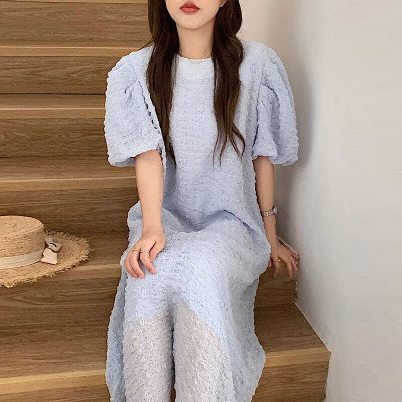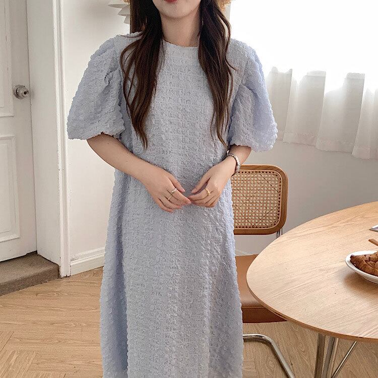 サマーブルーラウンドネックプリーツルーズカジュアルスリーブドレス ロングスカート ランタンスリーブ 夏物 Oネック 7/20 mi4624433341553