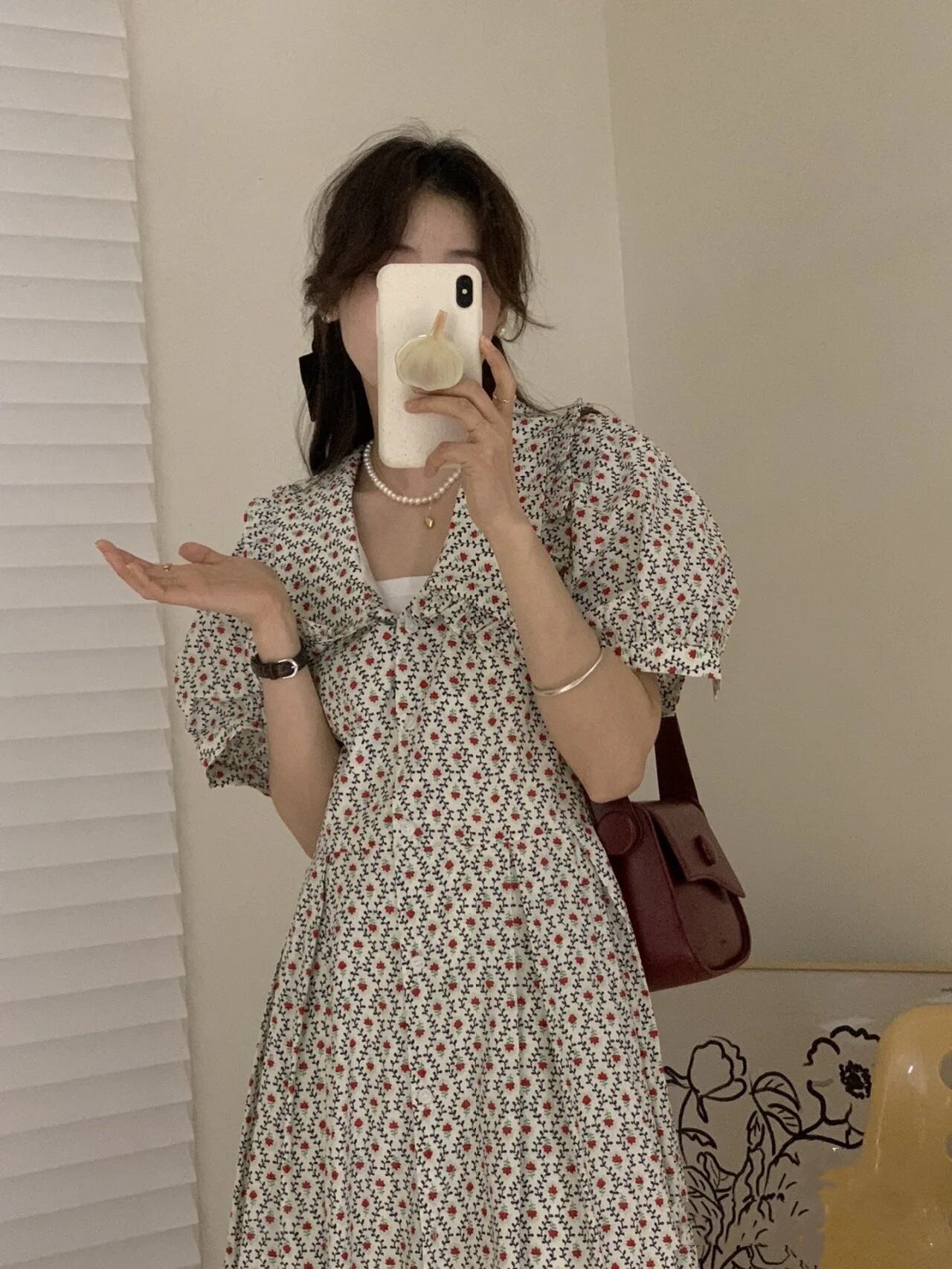 サマースタンダードカラーウェストフローラルスリーブドレス レトロ 夏物 花柄 7/20 mi4618112547244