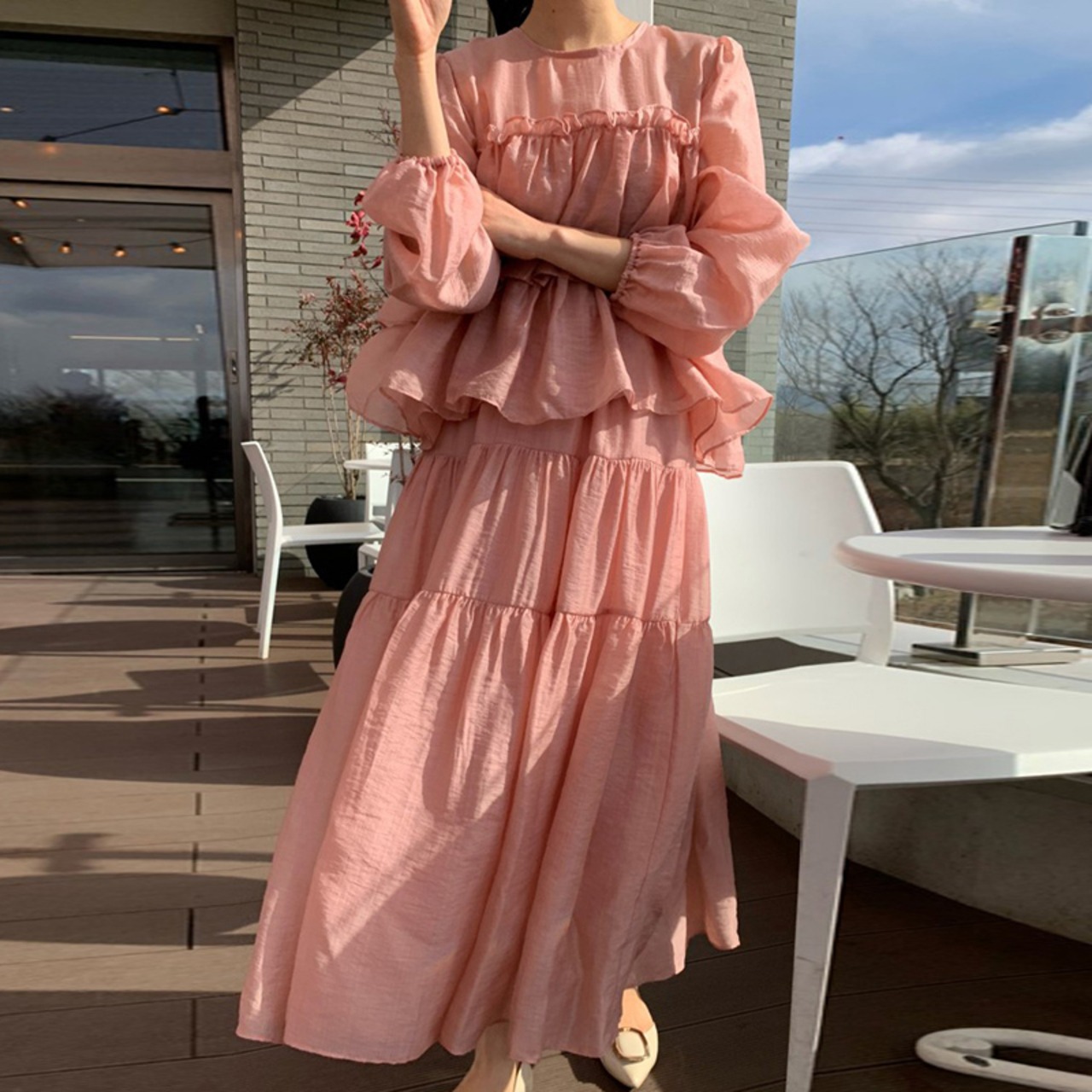 色:ピンクトップ,アプリコットトップ,ピンクのスカート,アプリコットスカート