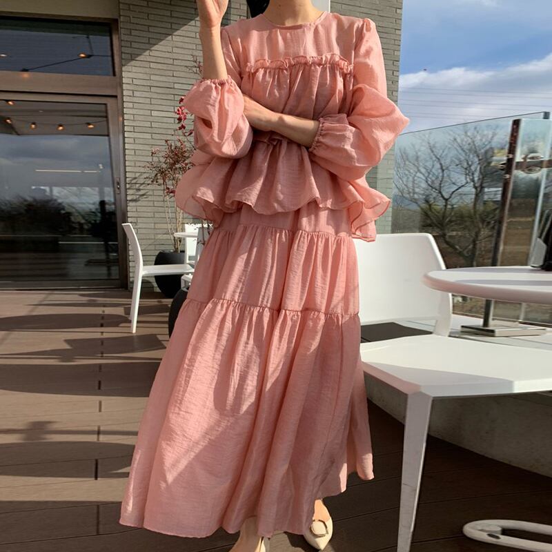 ラウンドネックルーズスリーブシャツ ハイウェストウェストスカート レディース 大人ガーリー スウィート キュート カジュアル Oネック 7/20 mi4658010906448