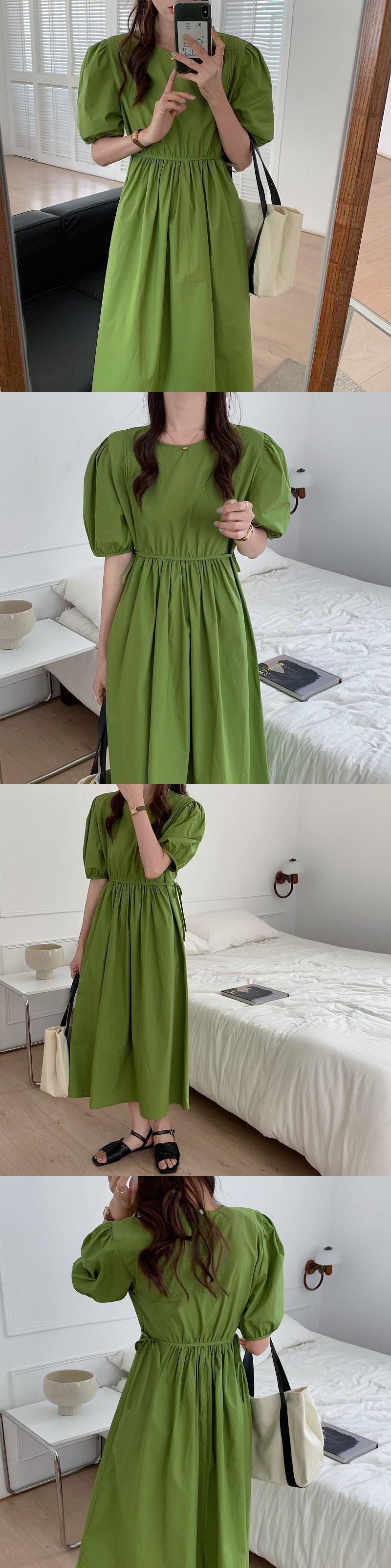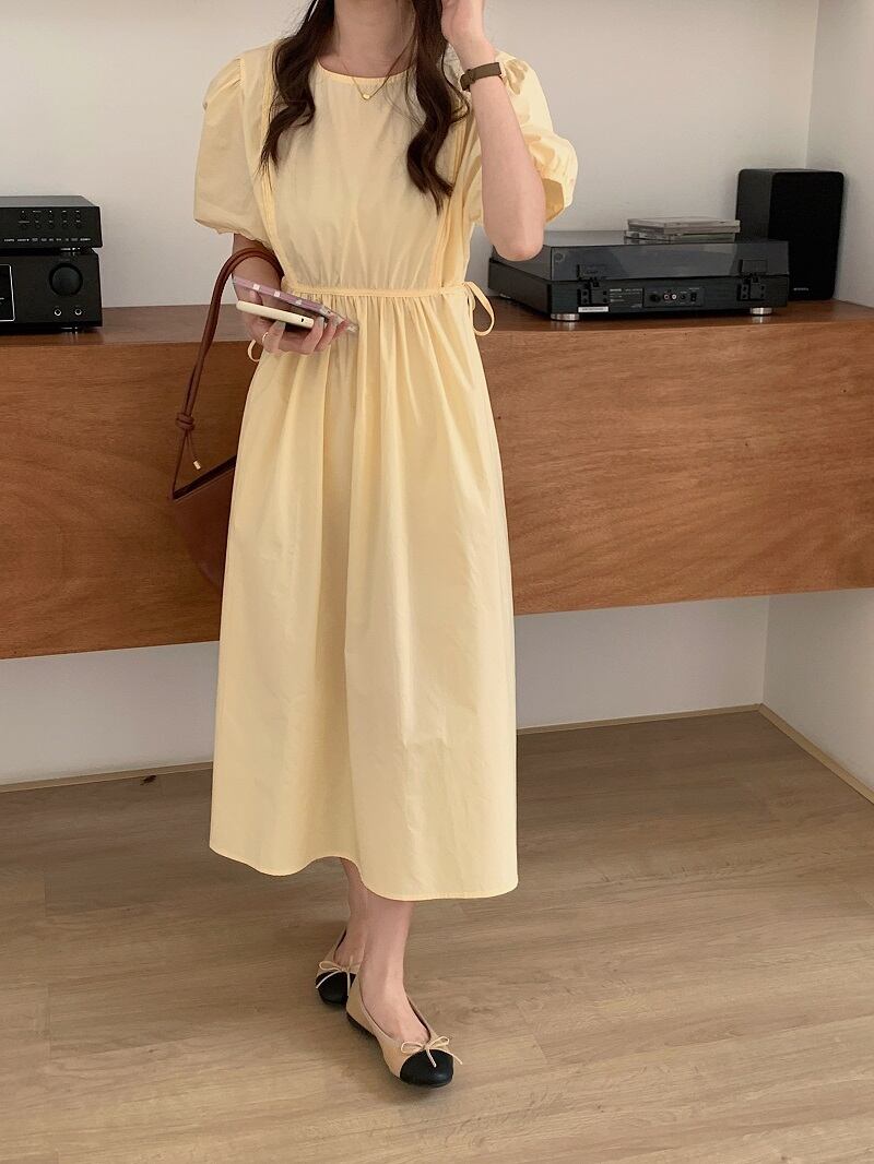 サマーカラーラウンドネックウェストプリーツソリッド スリーブドレス 夏物 Oネック ソリッドカラー 7/20 mi4670699209857