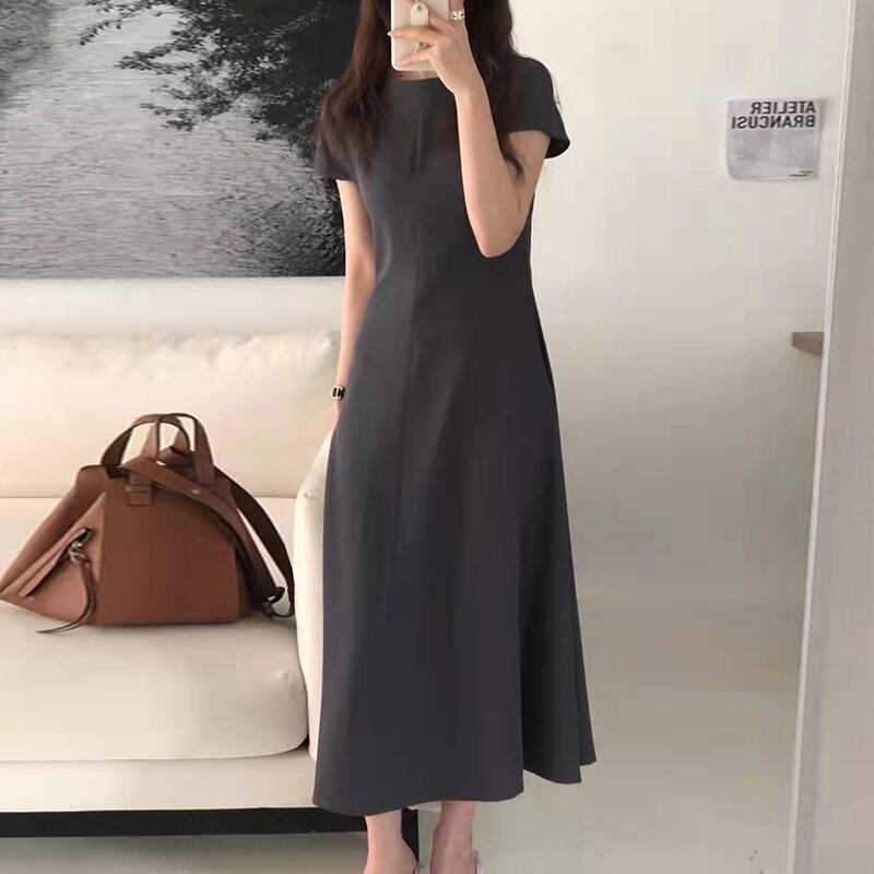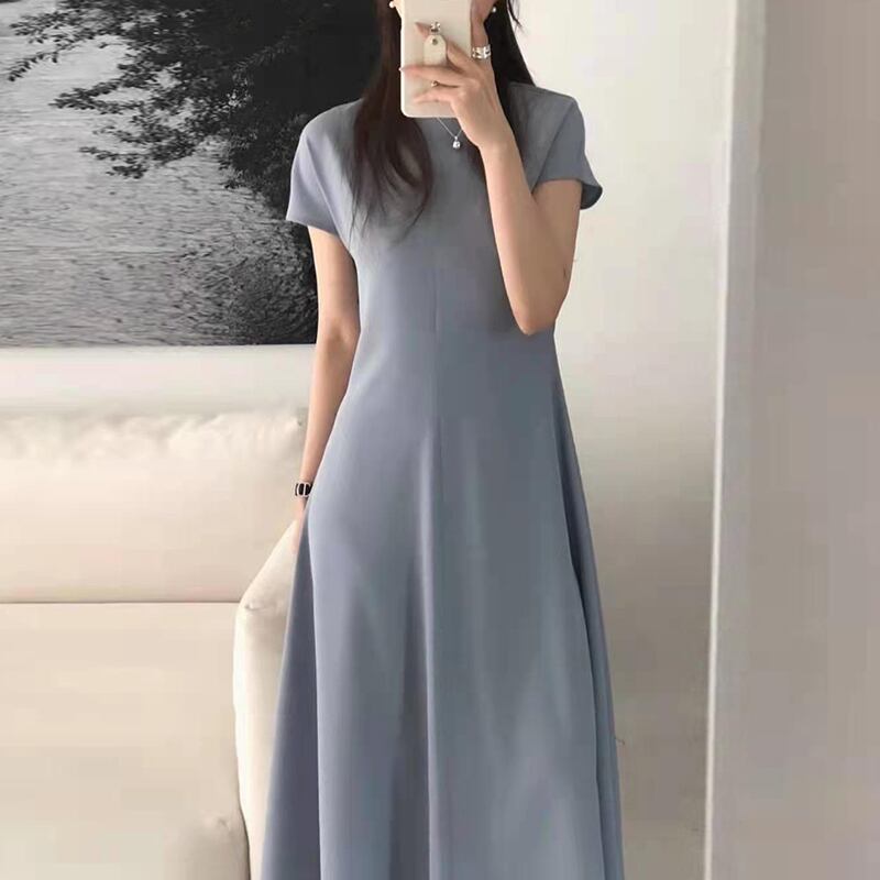 サマーラウンドネックスリム半袖スリーブソリッド カラードレス ロングスカート ショート ハーフスリーブ 夏物 Oネック ソリッドカラー 7/20 mi4633304826970
