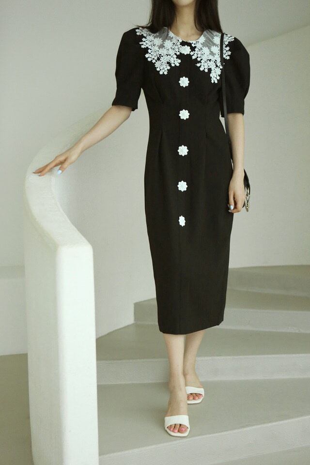 スタンダードレースボタンウェストスリーブドレス ロングスカート レトロ 7/20 mi4683777220673