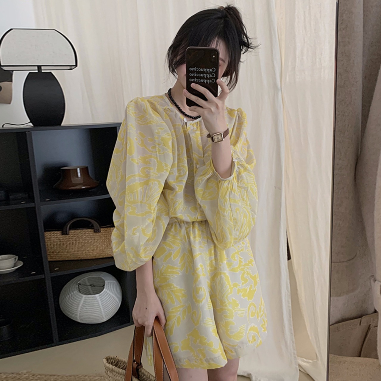サマーラウンドネックプリントスリーブシャツ ハイウェストウェストルーズワイドレッグショーツ ランタンスリーブ 夏物 ブルマー Oネック ワイドパンツ 7/20 mi4681284830732