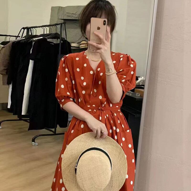 サマースタンダードVネックポケットウェストスリーブドレス レトロ エレガント 夏物 7/20 mi4698790496598