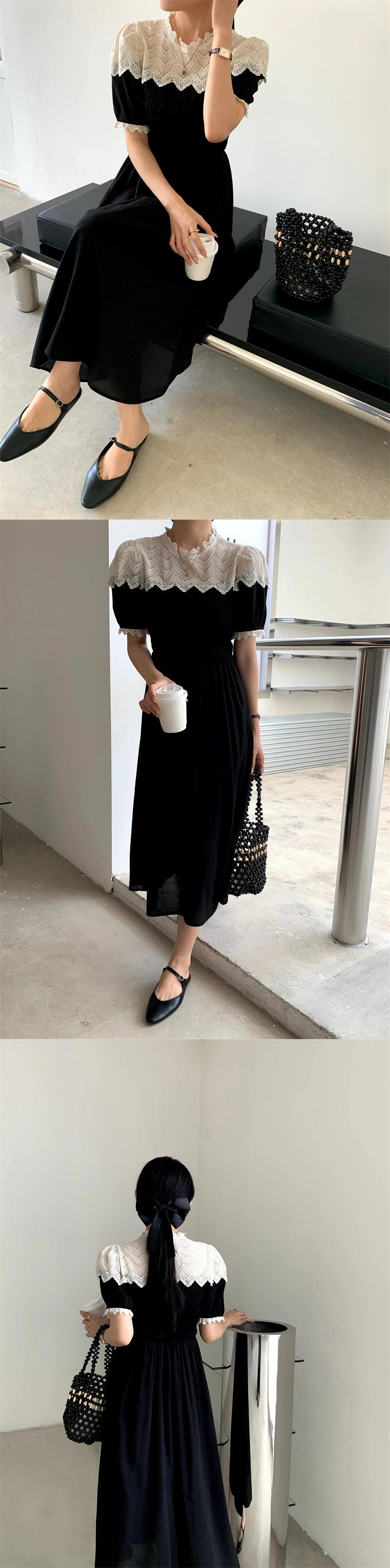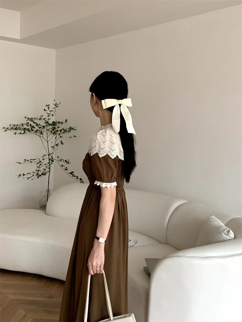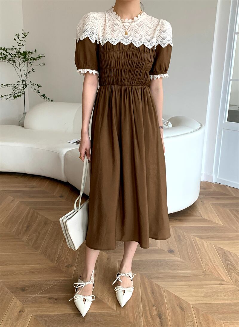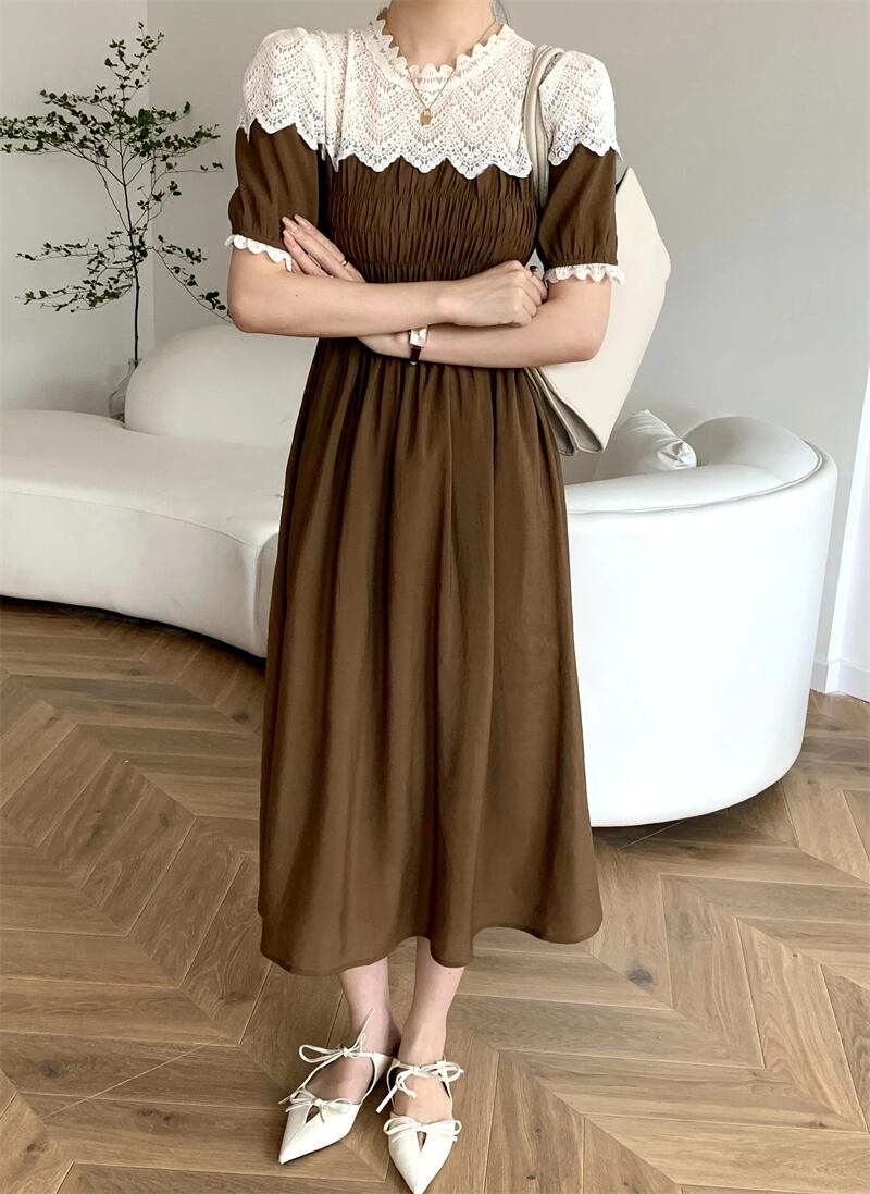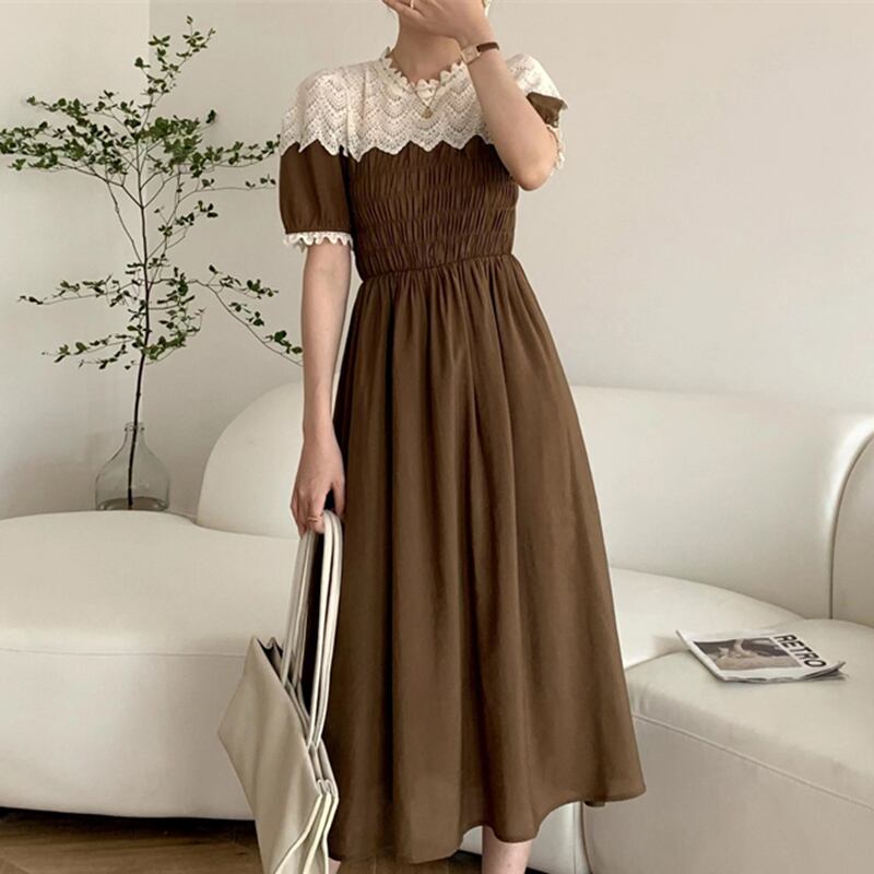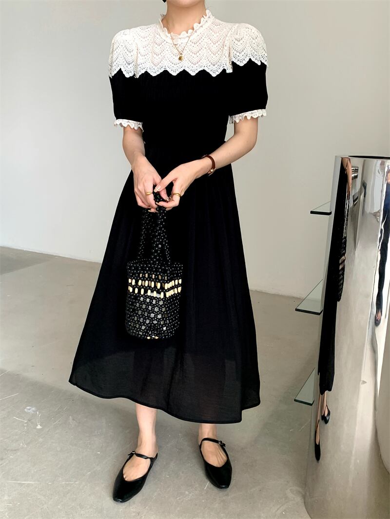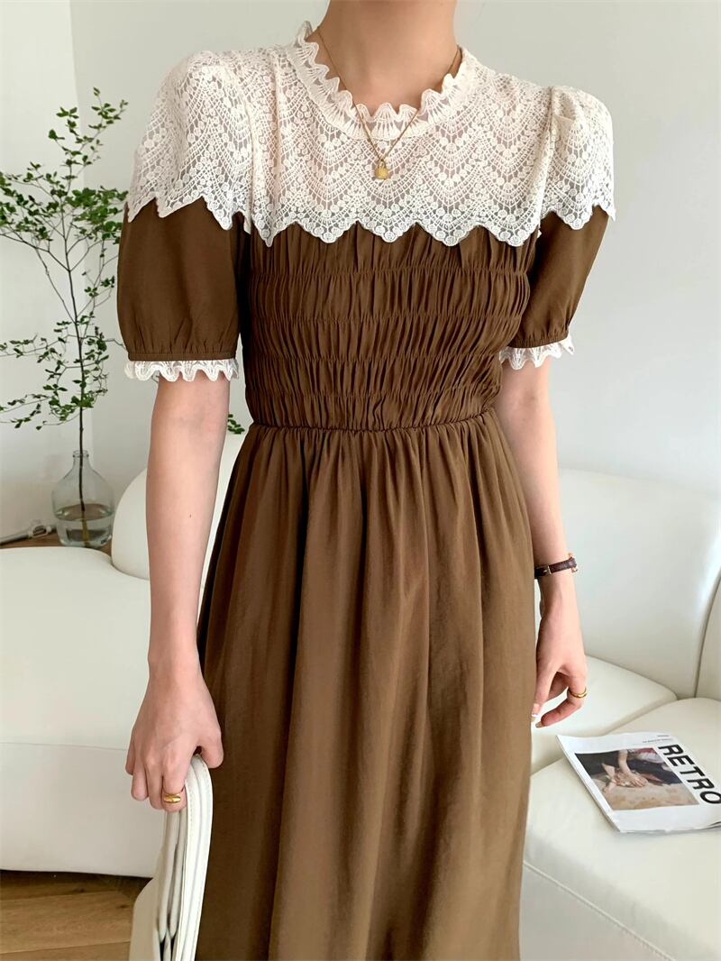 サマースタンダードラウンドネックレースFlowerデザイン プリーツウェストスリーブドレス レトロ 夏物 Oネック フラワーデザイン ステッチ 7/20 mi4698911030927