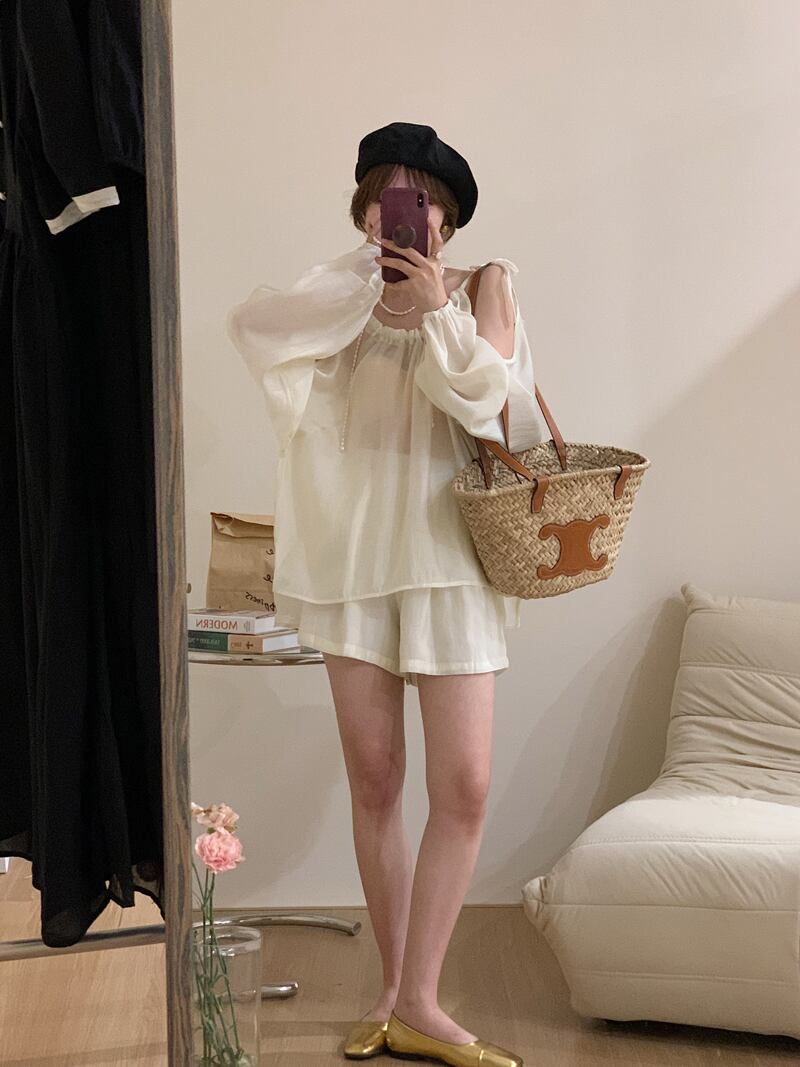 サマーラウンドネックプリーツスリーブシャツ ハイウェストウェストショーツ レディース 大人ガーリー スウィート キュート カジュアル 夏物 ブルマー Oネック 7/20 mi4688157374139