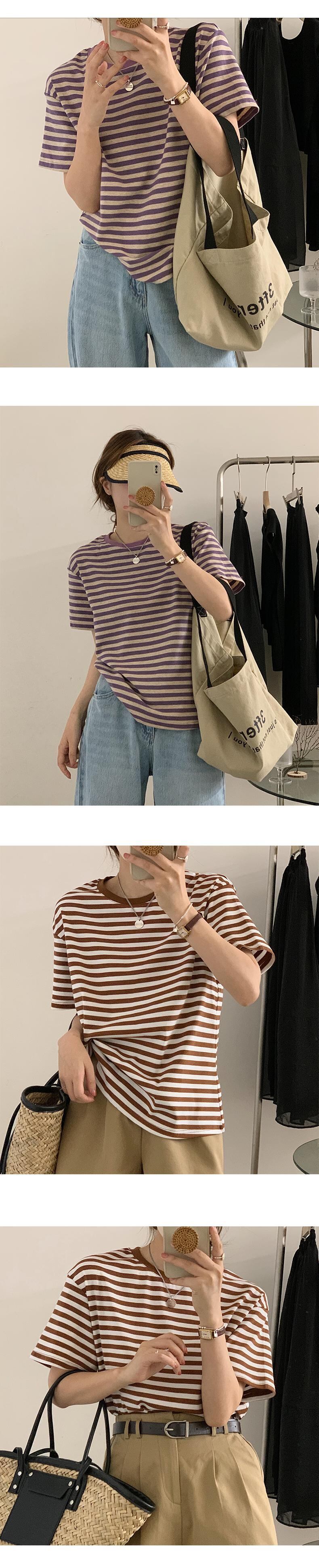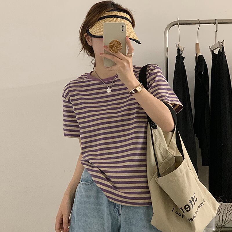 サマーラウンドネックストライプルーズTシャツ トップス レディース 夏物 Oネック 7/20 mi4646337570869
