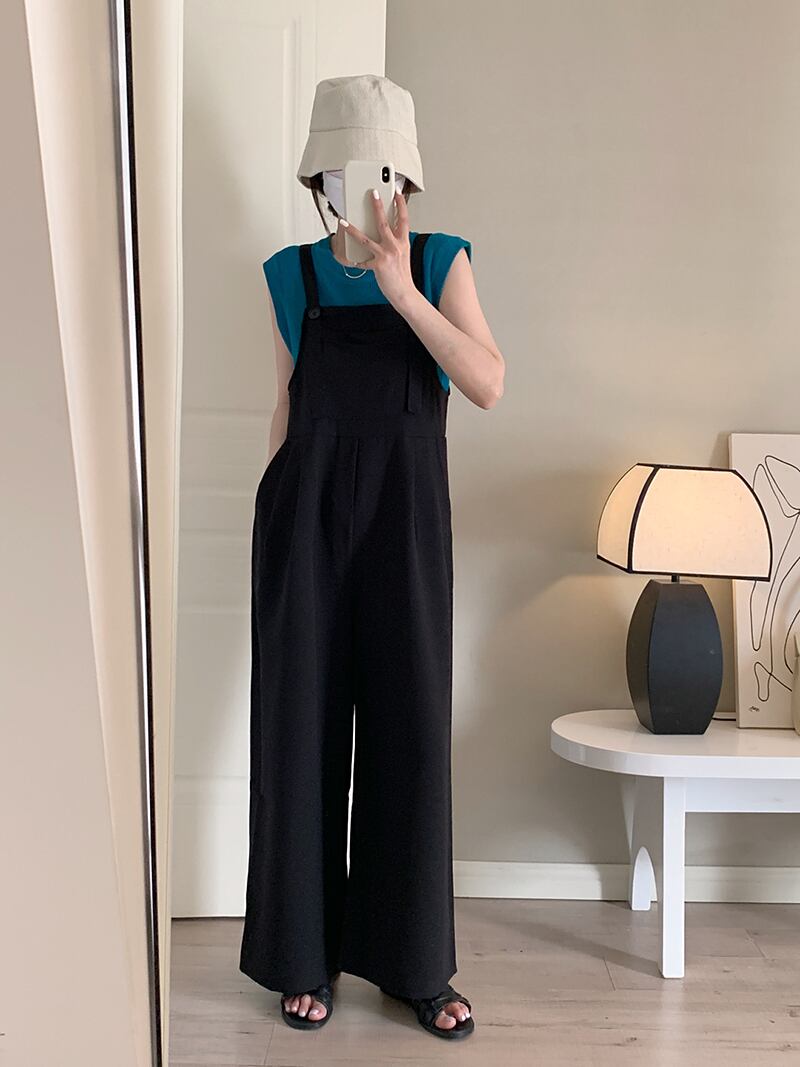 サマースタンダードラウンドネックノースリーブニットポケットワイドレッグオーバーオール レトロ 夏物 Oネック ワイドパンツ 7/20 mi4680059434074