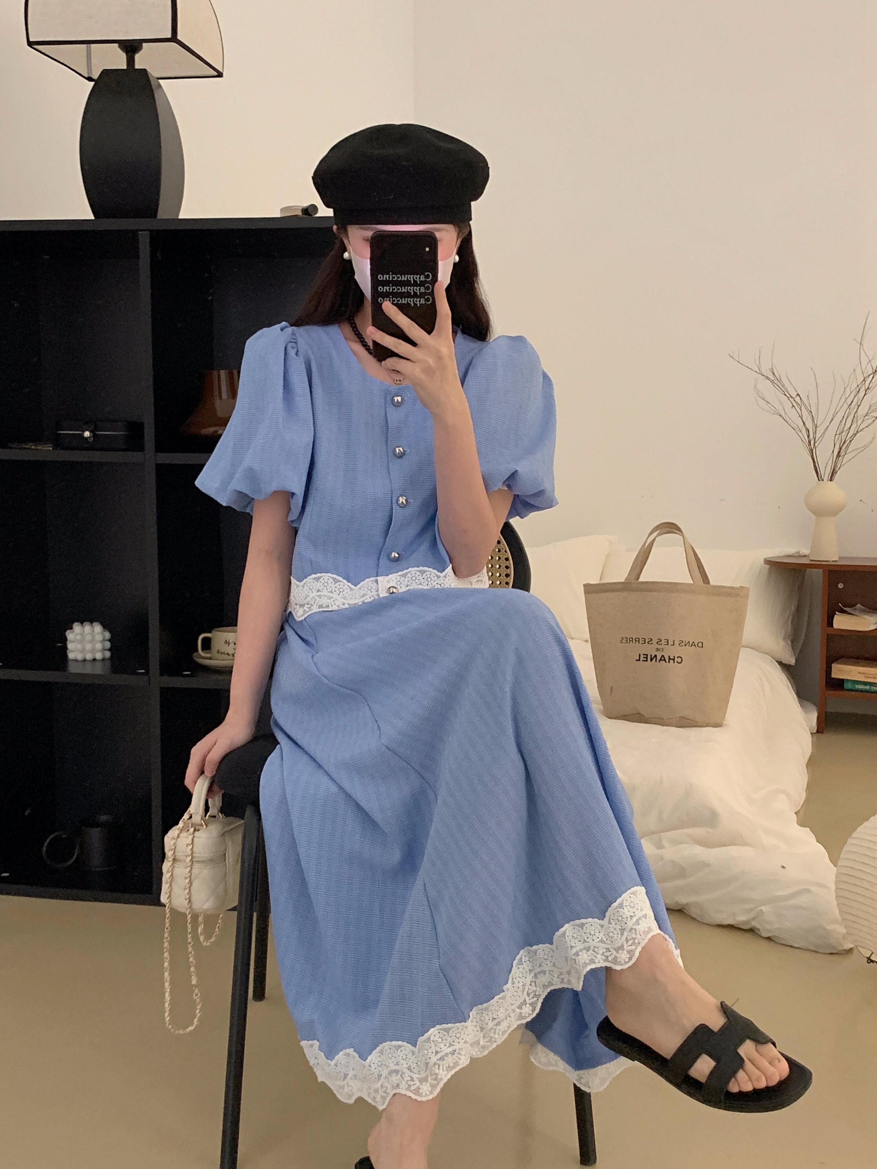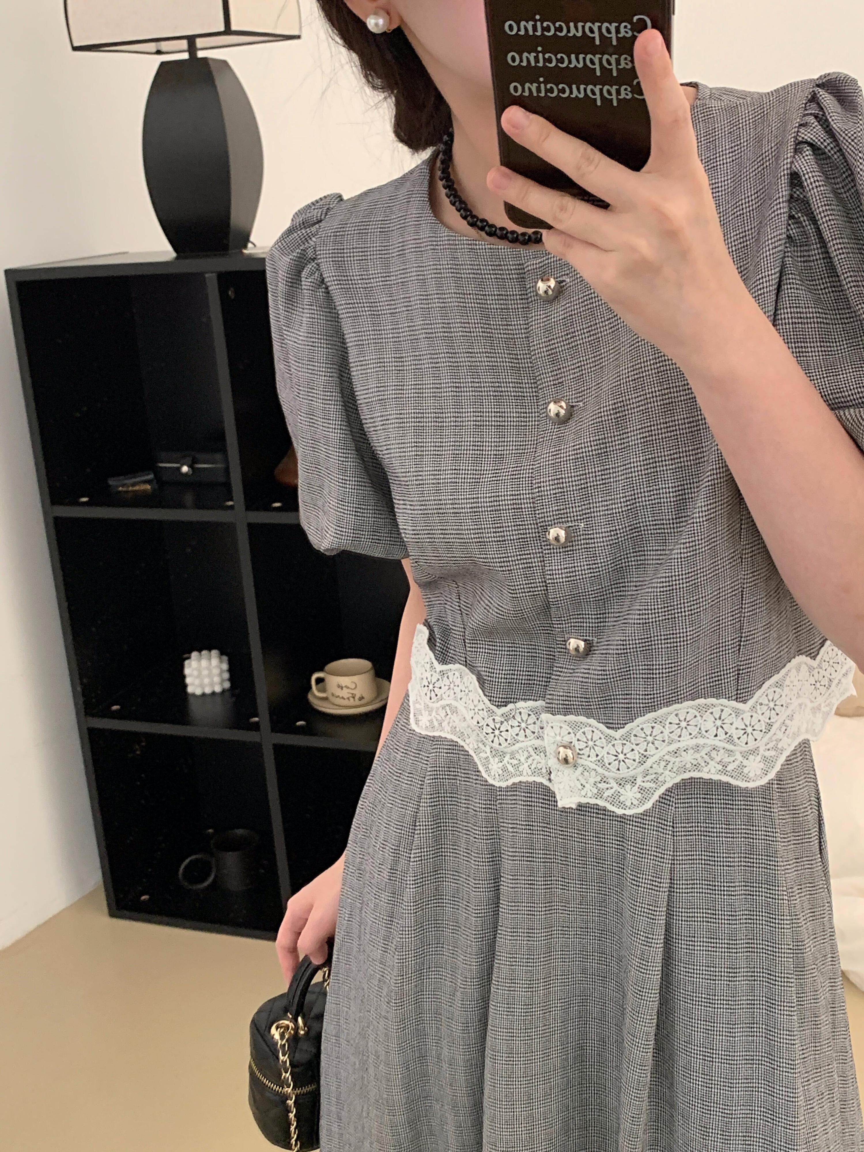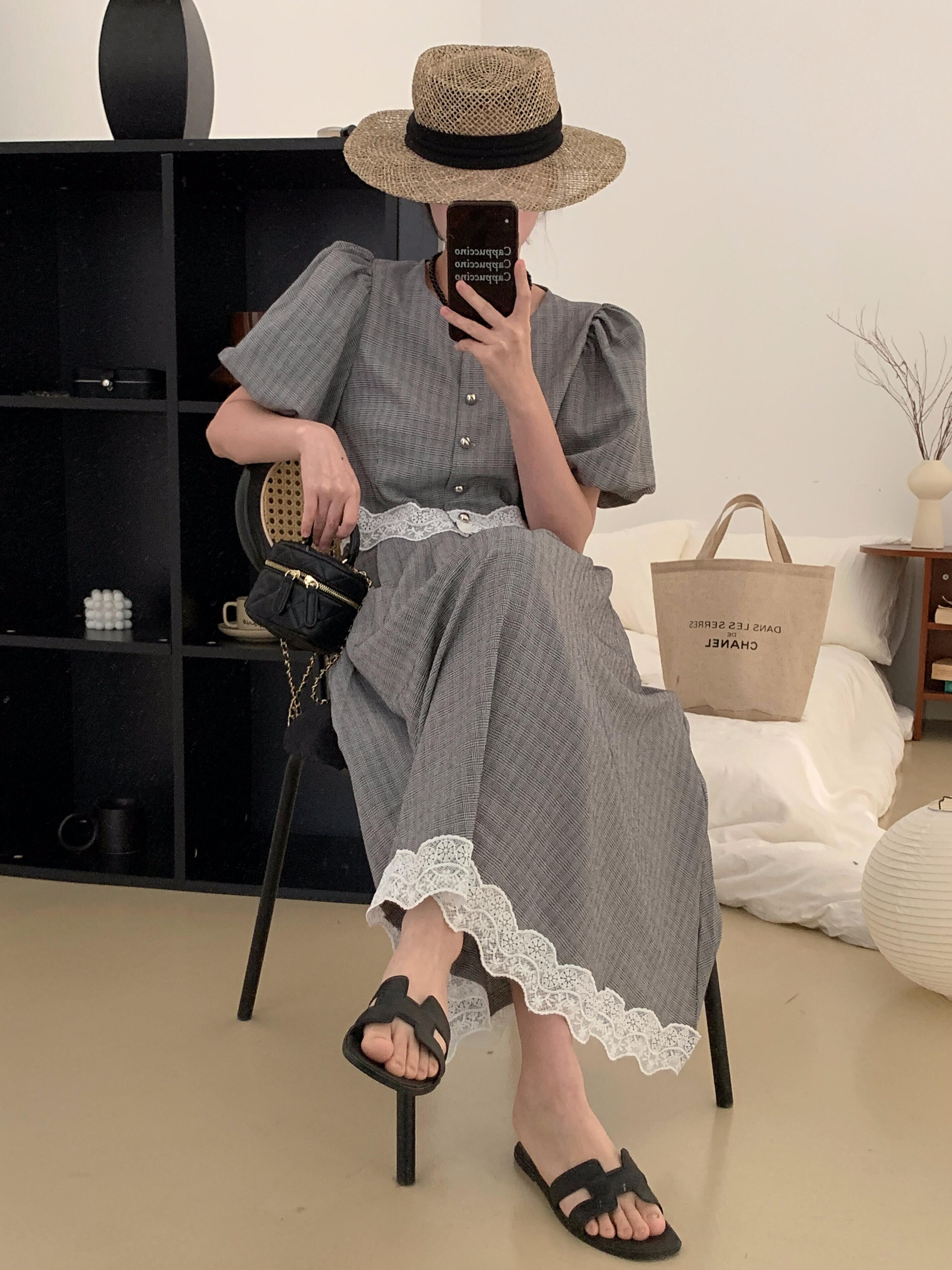 サマースタンダードラウンドネックレーススリーブシャツ ハイウェストウェストスリムスカート レディース レトロ 夏物 Oネック ステッチ 7/20 mi4647323641542