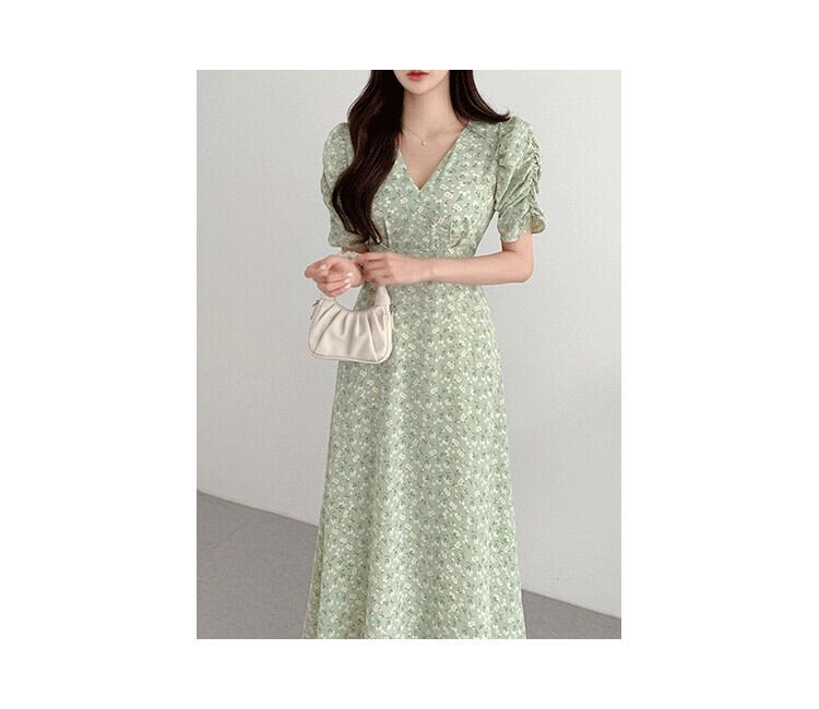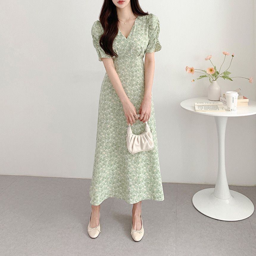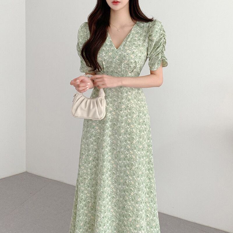 サマーVネックハイウェストスリムフローラルドレス ロングスカート レディース 夏物 花柄 7/20 mi4680147796782