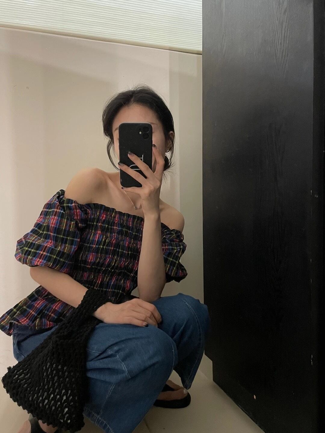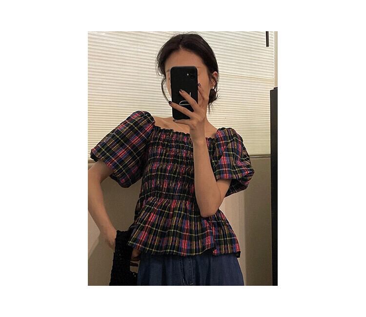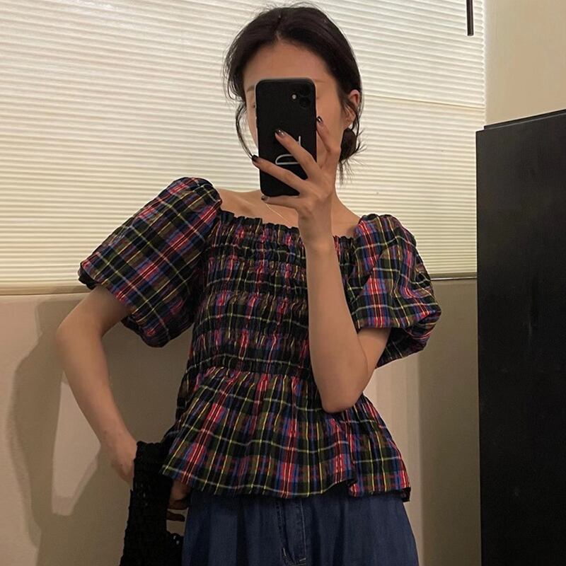サマースタンダードカラープリーツルーズスリーブ格子柄シャツ レトロ 夏物 7/20 mi4688012537804
