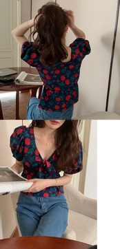 サマースタンダードVネックプリント柄スリーブシャツ トップス レディース レトロ 夏物 7/20 mi4675495356165
