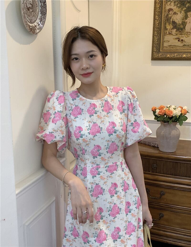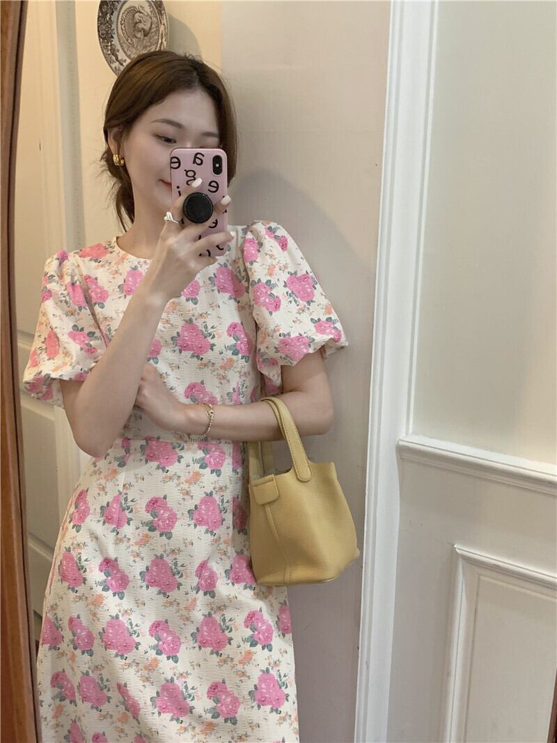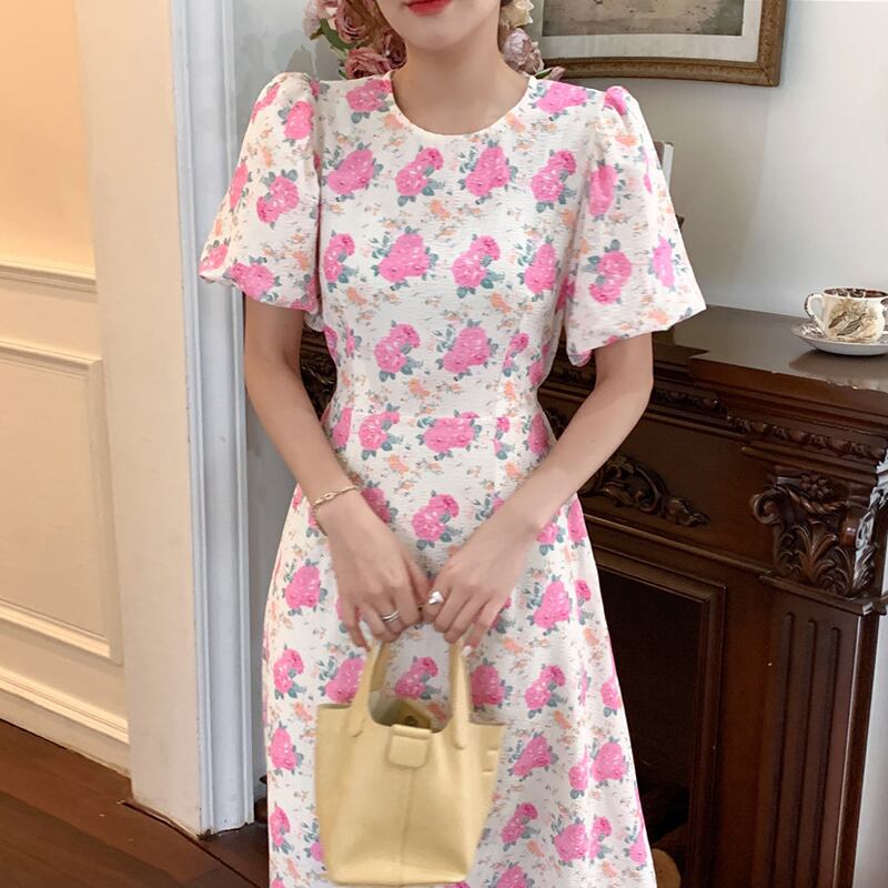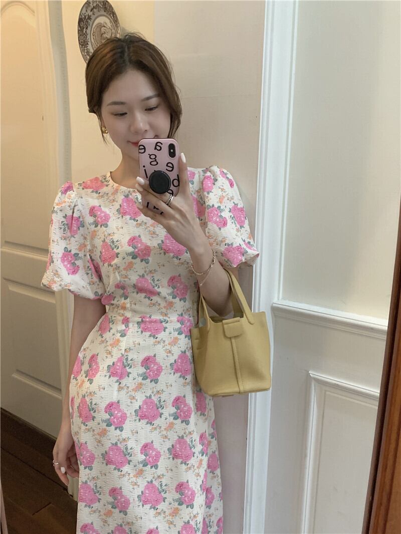 サマーラウンドネックウェスト薄手ロングフローラルシフォンドレス 大人ガーリー スウィート キュート カジュアル 夏物 花柄 Oネック 7/20 mi4614018886992