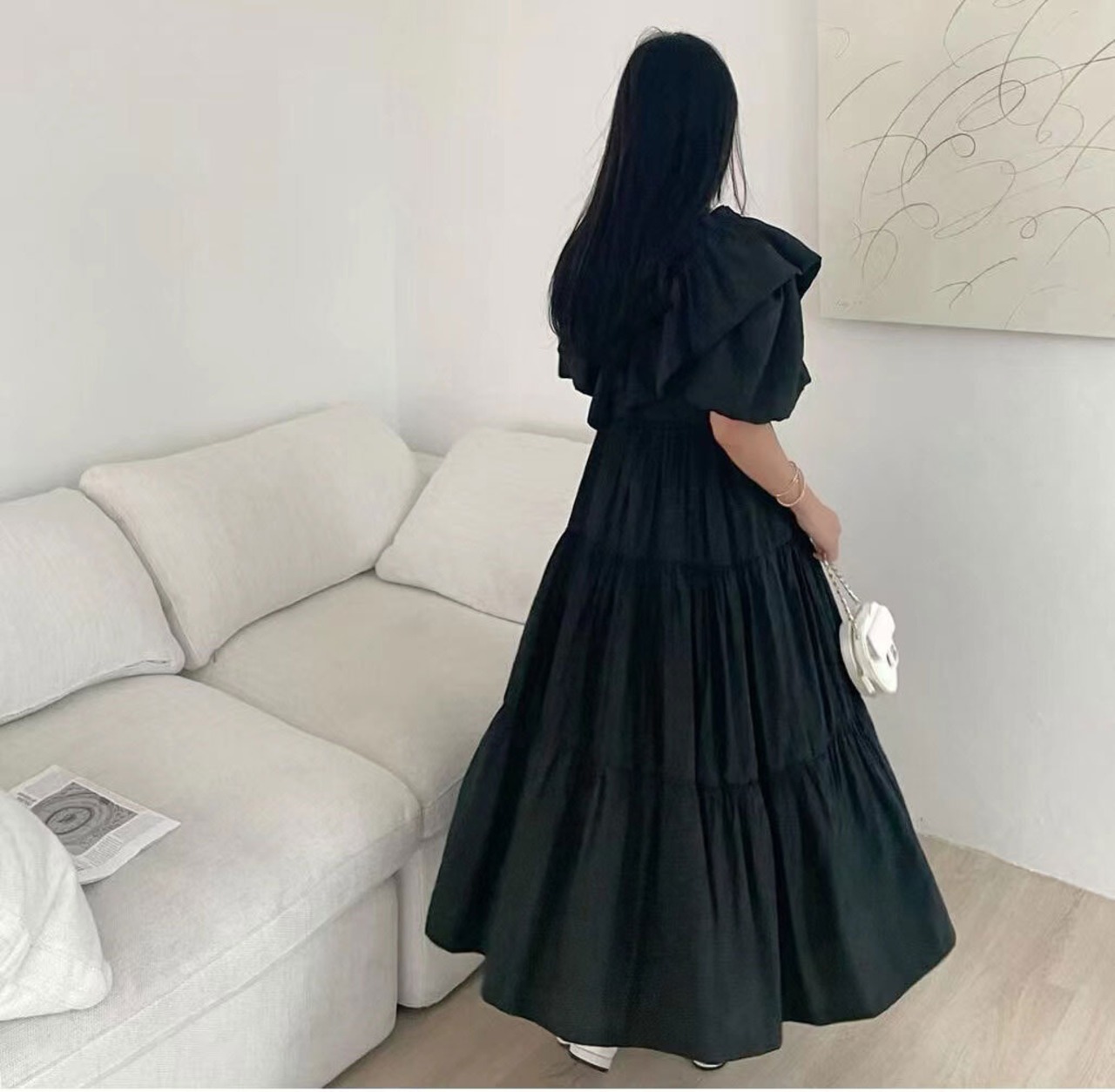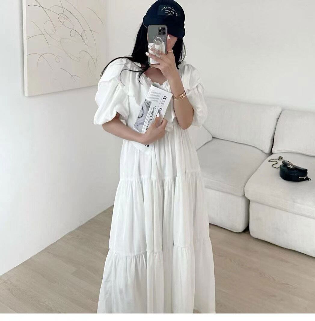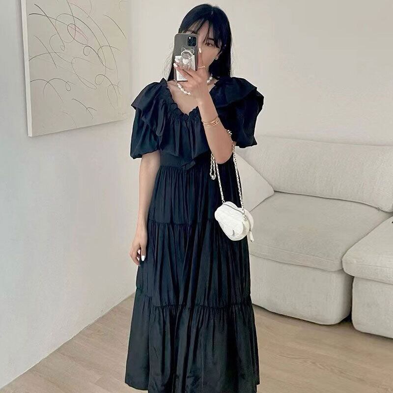 サマーVネックスリーブドレス ロングスカート レッド ランタンスリーブ 大人ガーリー スウィート キュート カジュアル 夏物 ステッチ 7/20 mi4638682066564