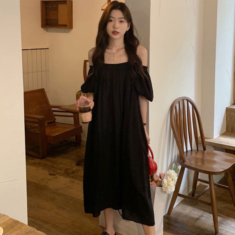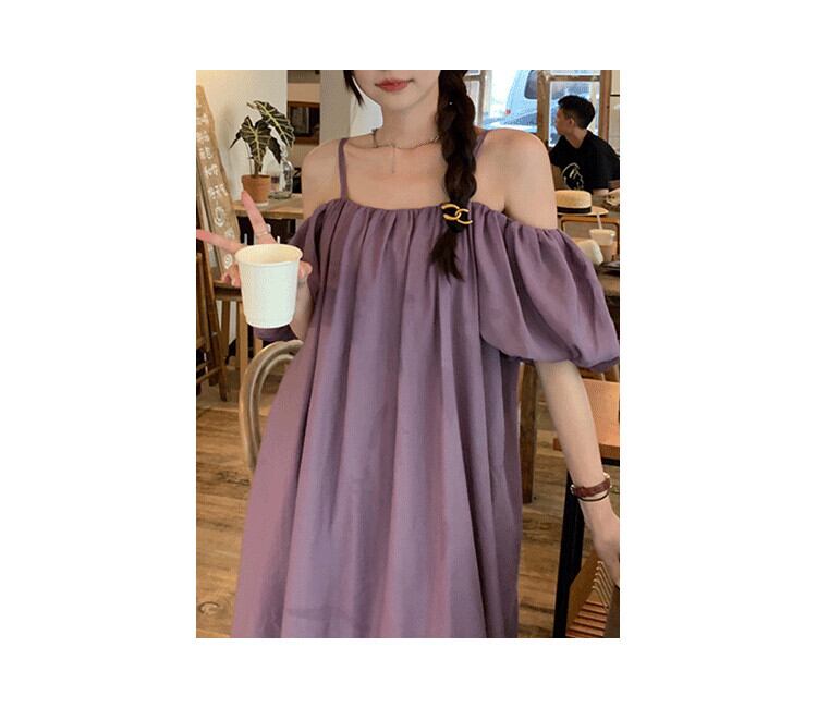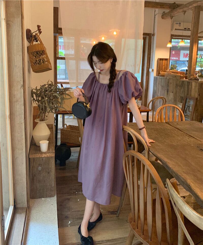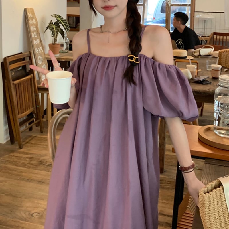 サマーカラーストラップレスルーズカジュアルスリーブドレス ランタンスリーブ 夏物 7/20 mi4624564089394