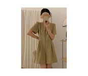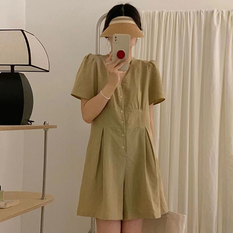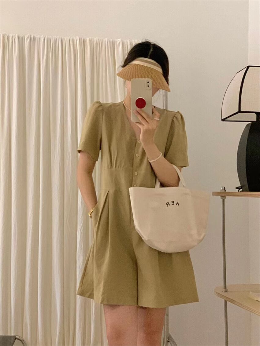 サマースタンダードVネックプリーツポケットルーズジャンプスーツ オールインワン レディース レトロ 夏物 7/20 mi4631184474355