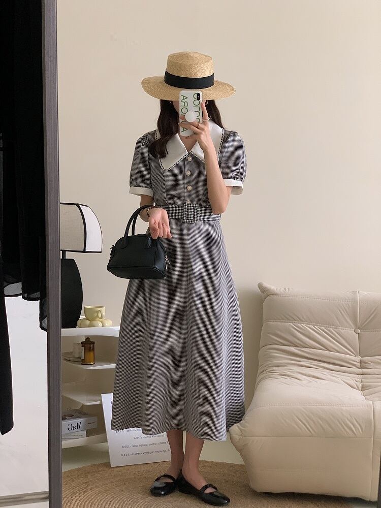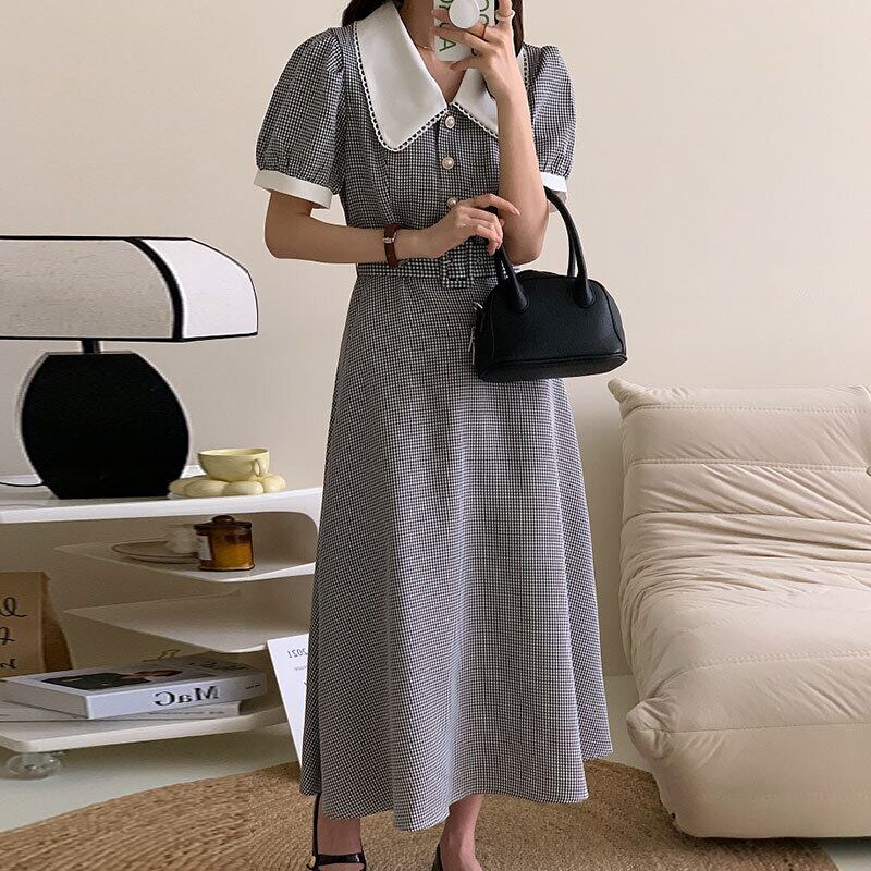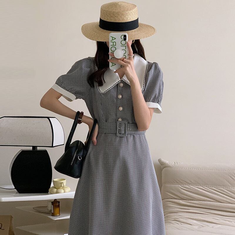 サマースタンダードレースカラーパールボタンスリーブ格子柄ドレス ベルト レディース レトロ 夏物 ハーネス 真珠 7/20 mi4660607358522