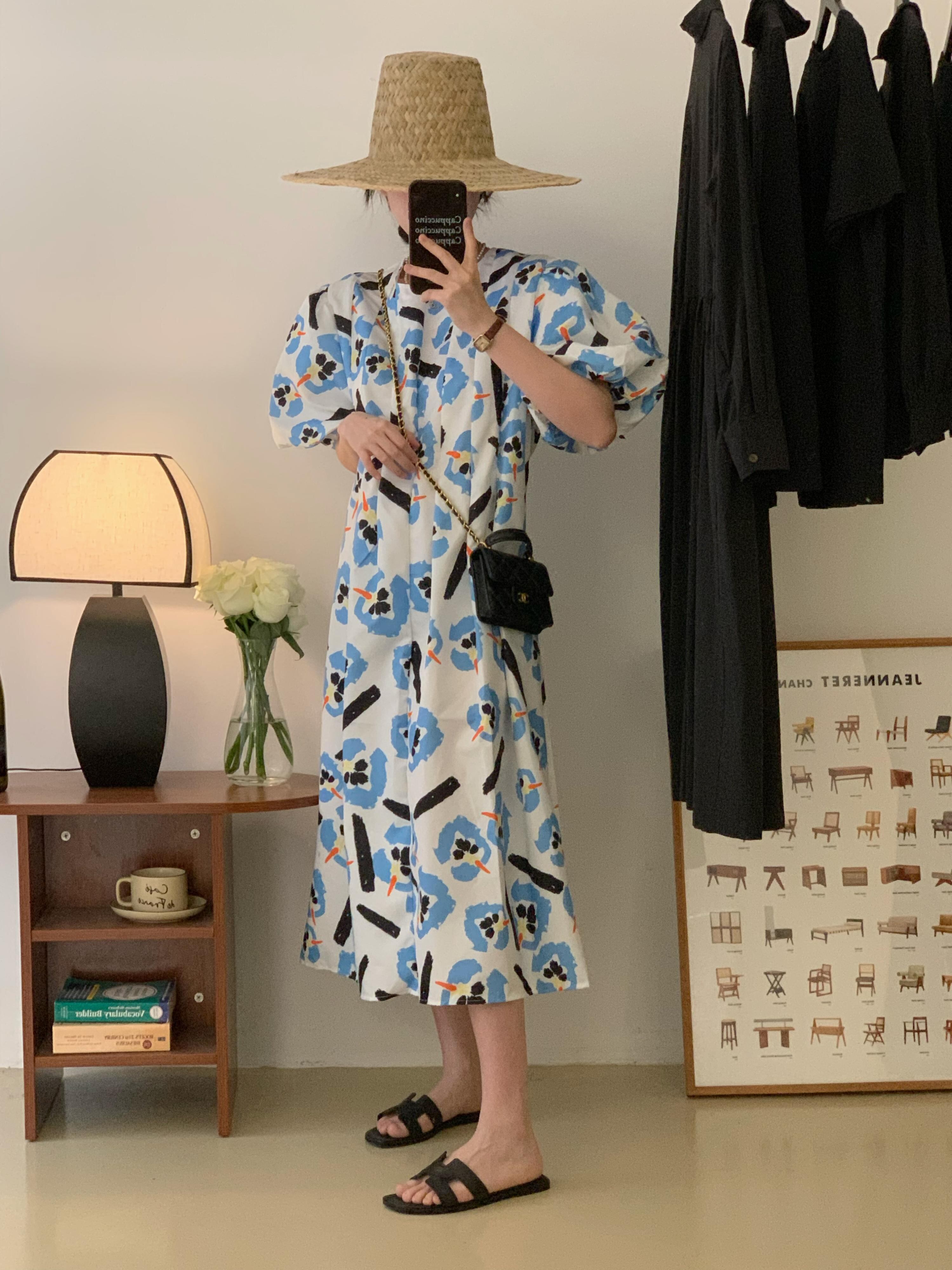 サマーラウンドネックプリーツフローラルプリント柄ルーズスリーブドレス ロングスカート エレガント 夏物 花柄 Oネック 7/20 mi4639970077295