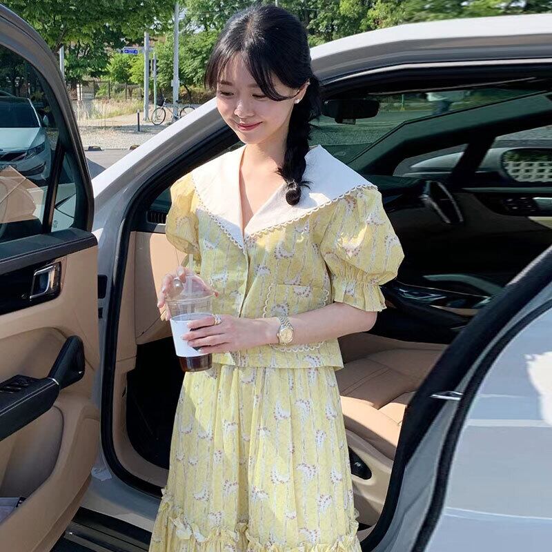 サマースタンダードスタイルレースフローラルシャツ ハイウェストウェストスカート レトロ 夏物 花柄 7/20 mi4637996381695