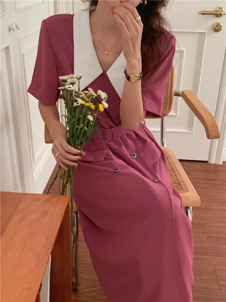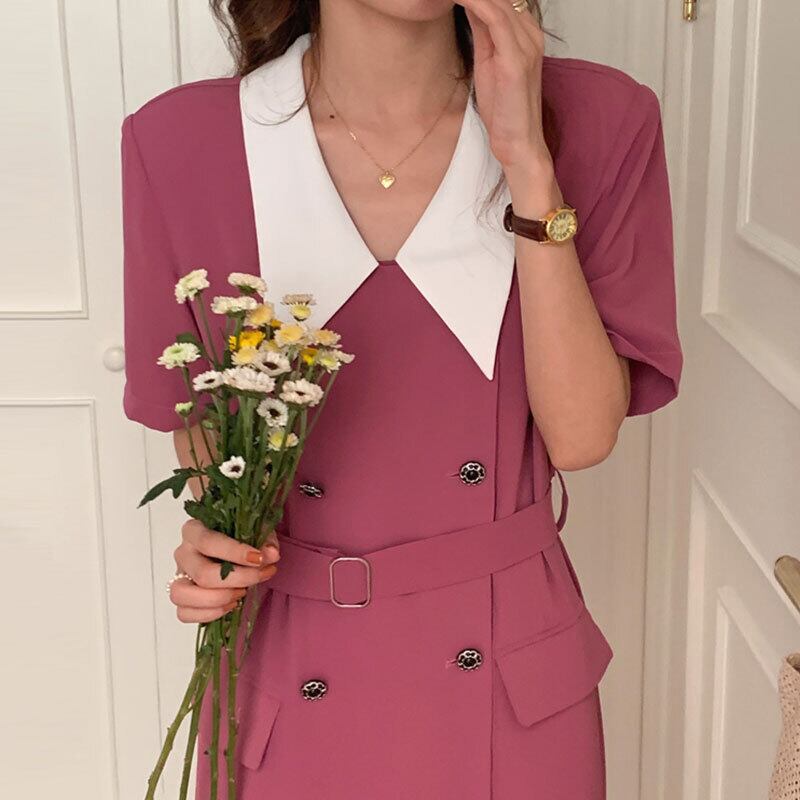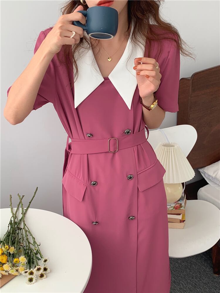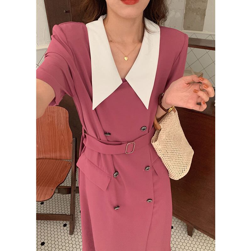 サマースタンダードカラーダブルブレストベルト ウェストドレス レトロ 夏物 ハーネス 7/20 mi4639122081374