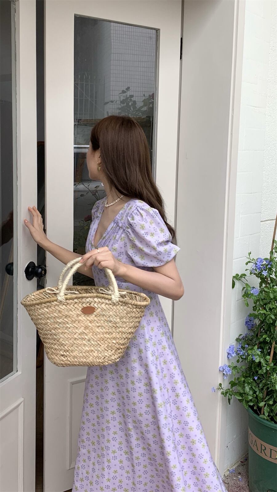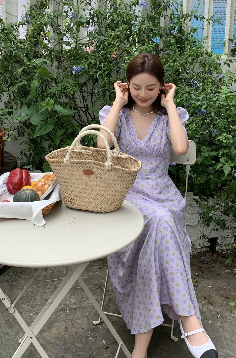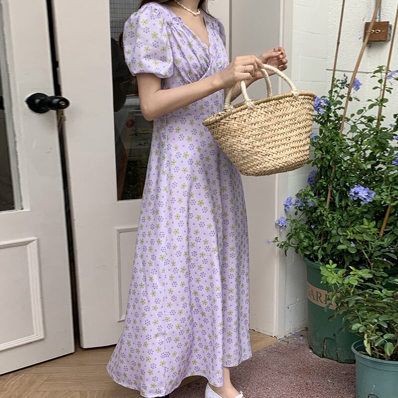サマーVネックプリーツウェスト薄手スリーブフローラルドレス 夏物 花柄 7/20 mi4654482300261