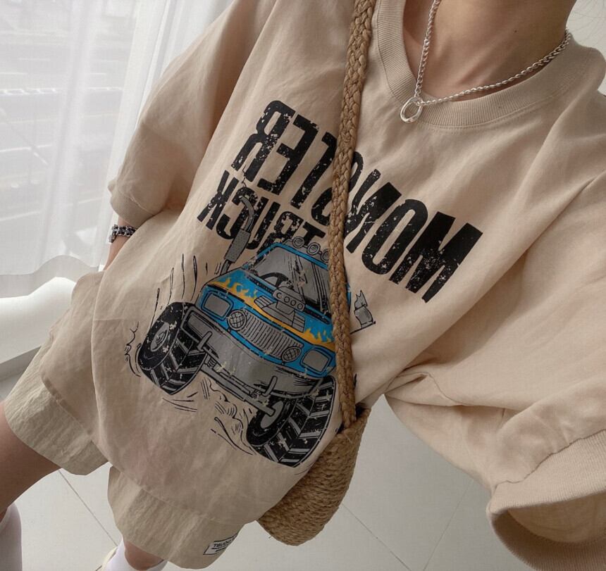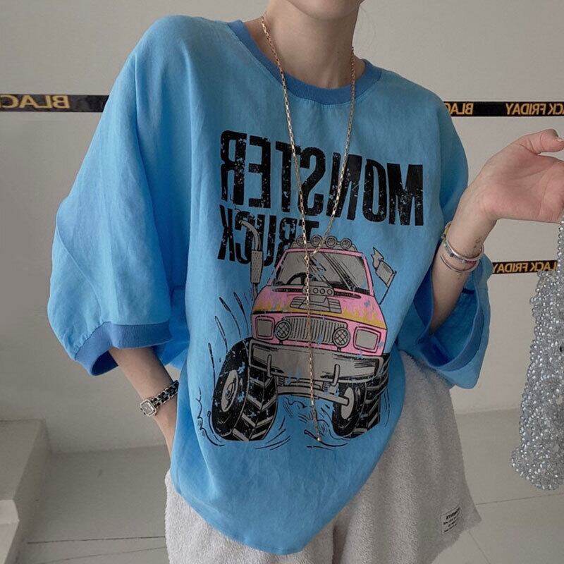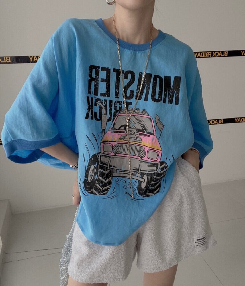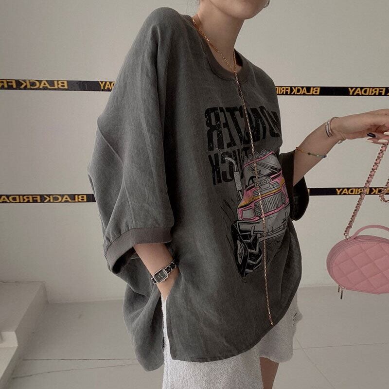 オータムラウンドネックプリントルーズカジュアルスリットスリーブTシャツ トップス レディース 秋物 Oネック 7/20 mi4631014556813
