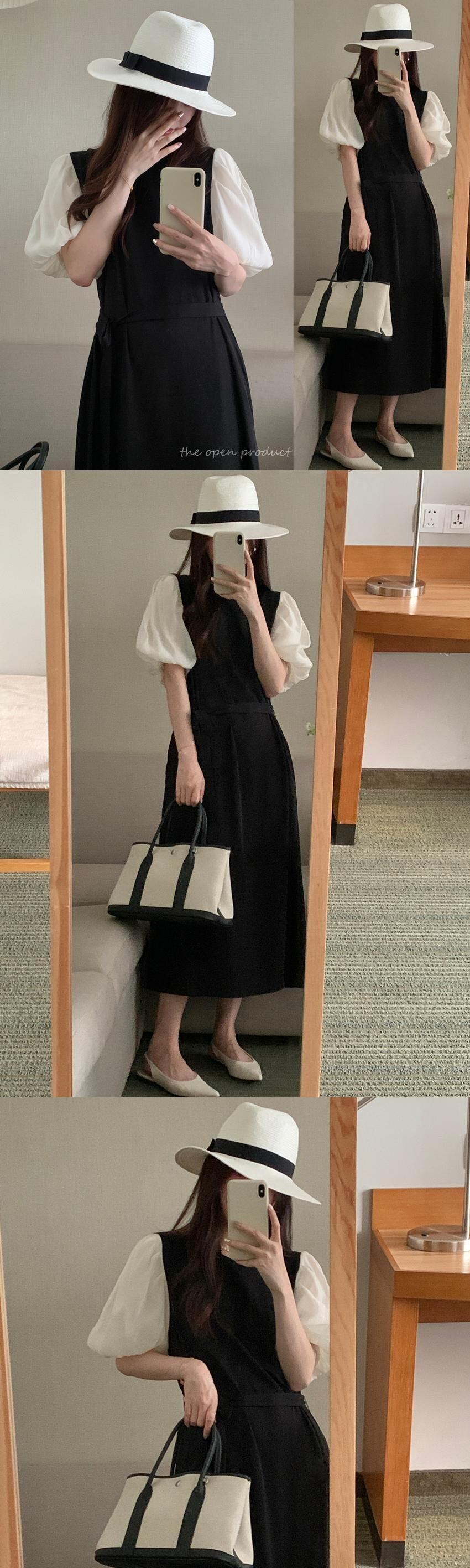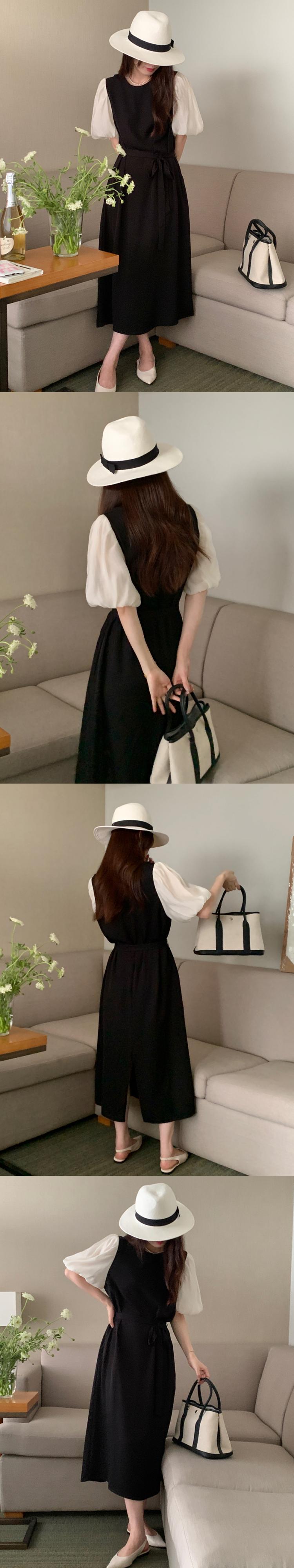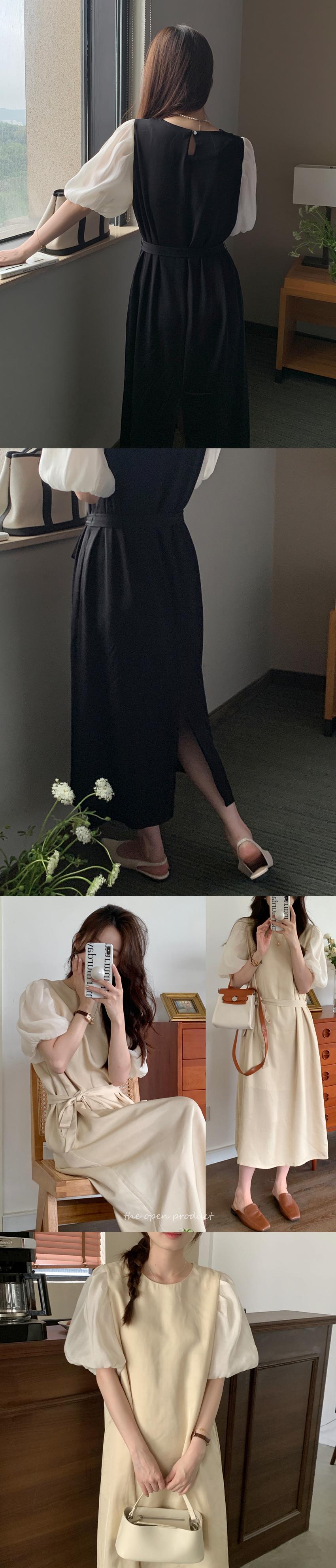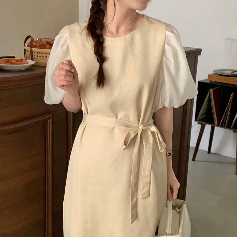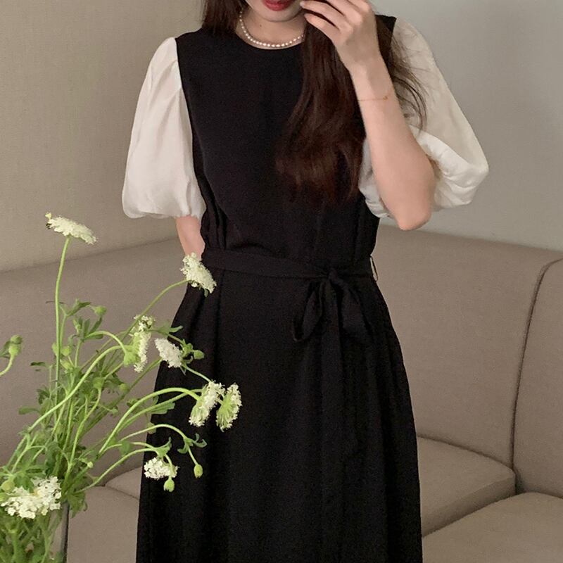 サマースタンダードスタイルラウンドネックカラースリーブロングドレス ランタンスリーブ レトロ 夏物 Oネック ステッチ 7/20 mi4656754156589