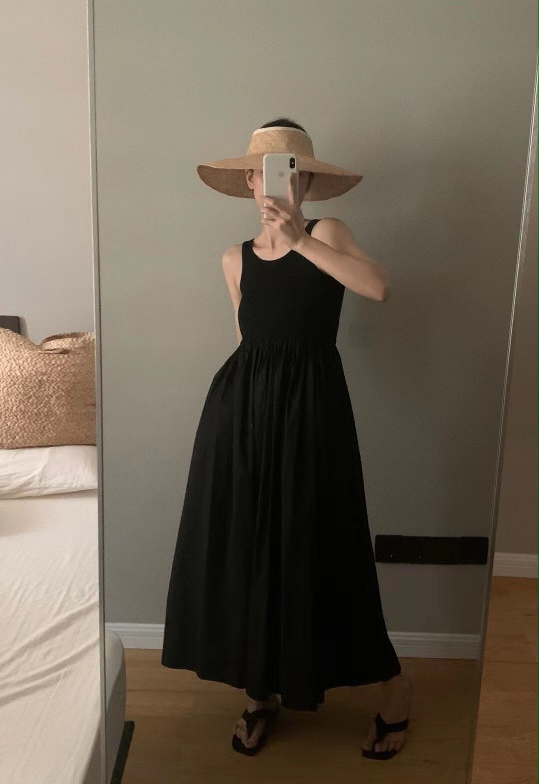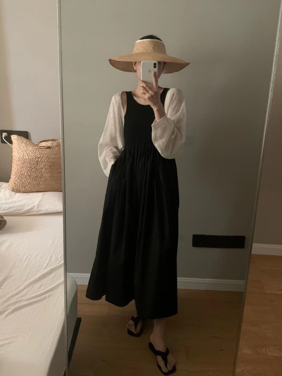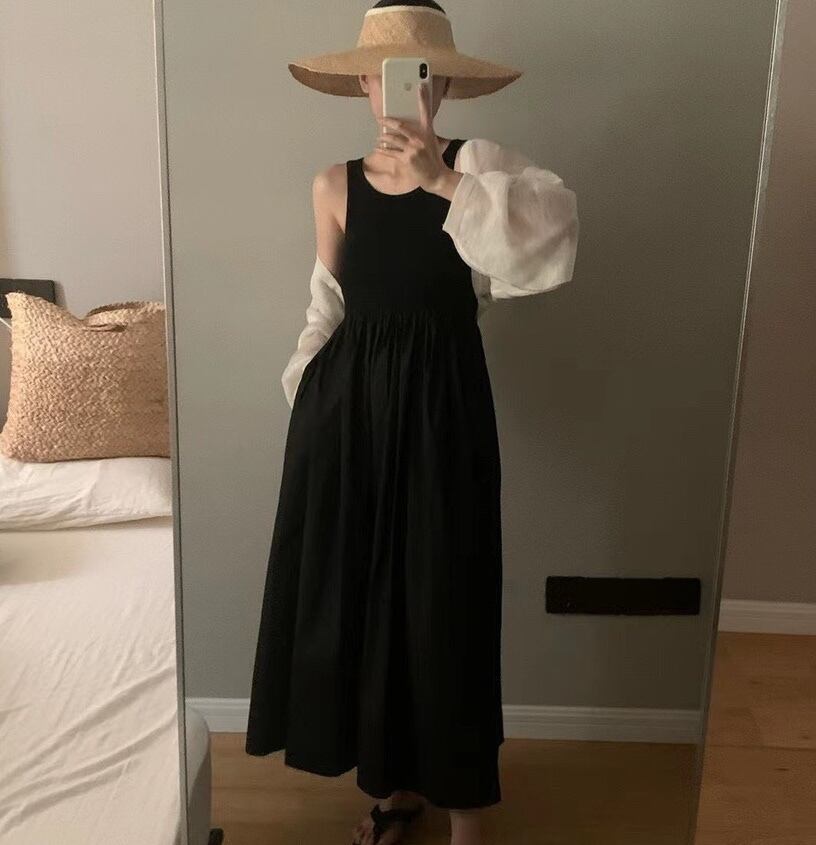 色:黒い日焼け防止服,白い日焼け止め,スカート黒,サスペンダースカートライスアプリコット