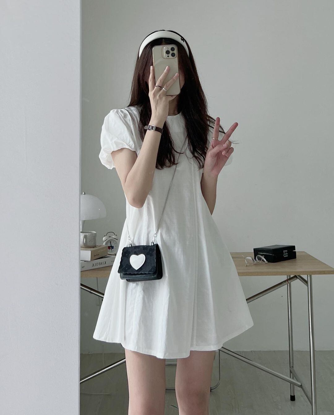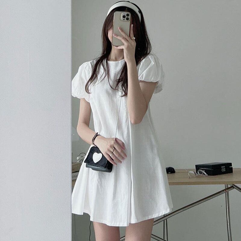サマーラウンドネックプリーツルーズAラインショートドレス 夏物 Oネック 7/20 mi4658499793256