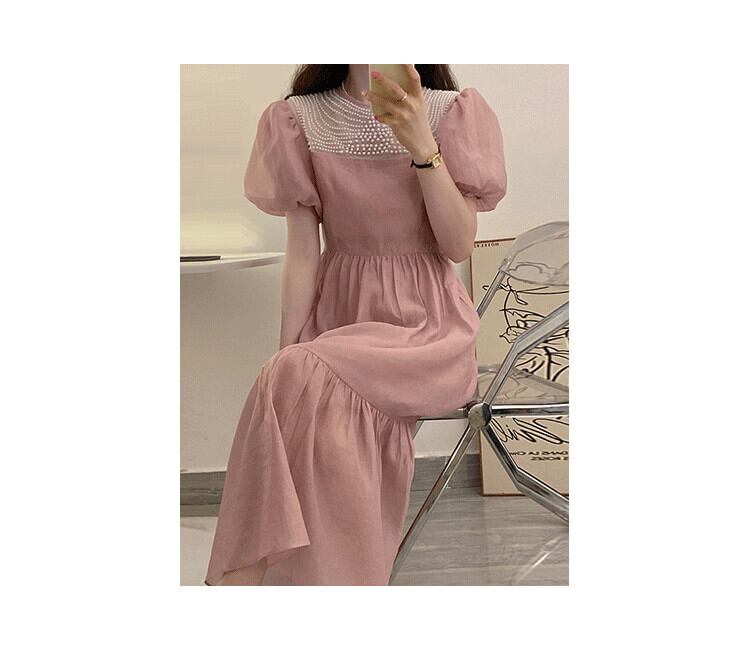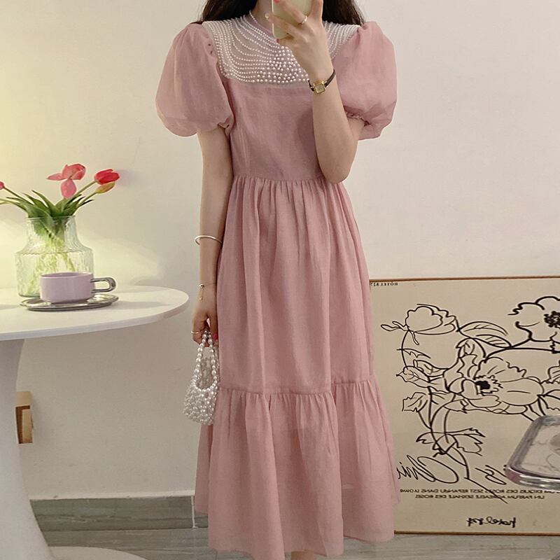 サマーラウンドネックプリーツウェストスリムスリーブドレス 大人ガーリー スウィート キュート カジュアル 夏物 Oネック 7/20 mi4681870290929