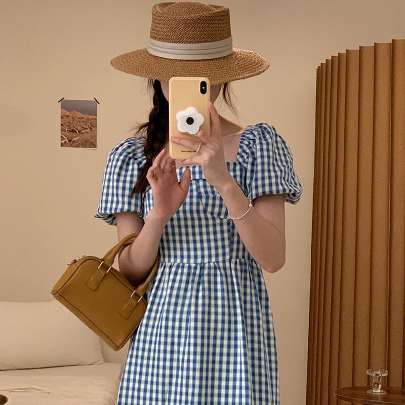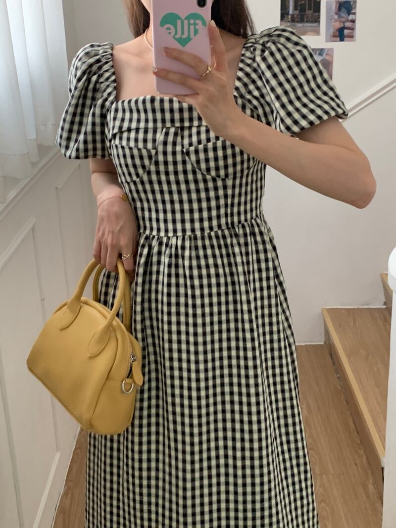 サマースタンダードカラーバックレースリボンスリーブ格子柄ドレス レトロ 夏物 スクウェア 7/20 mi4678245946717