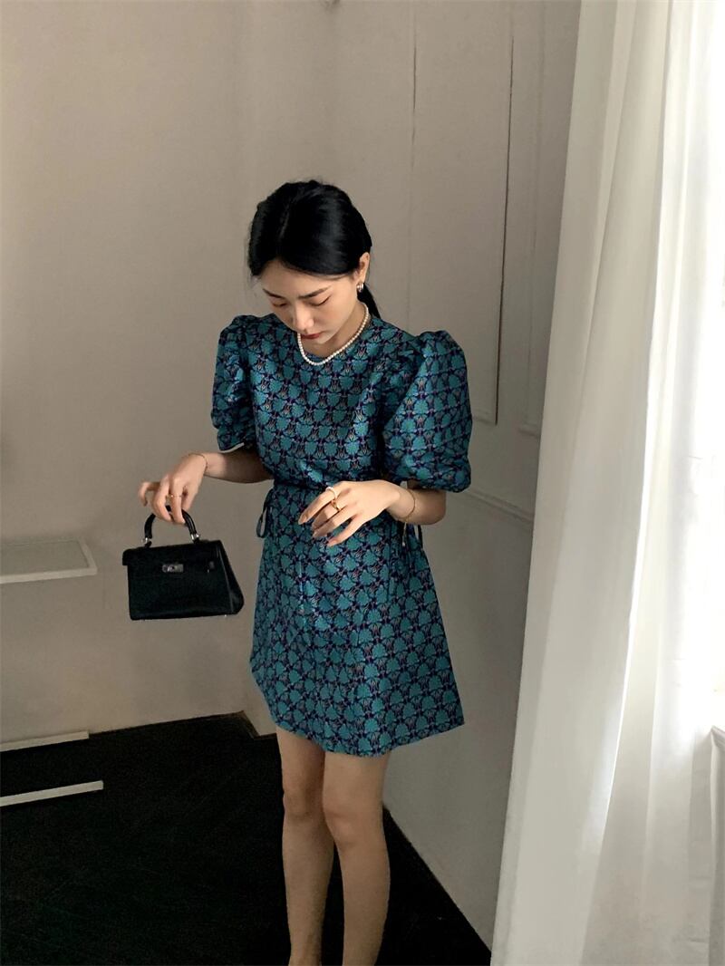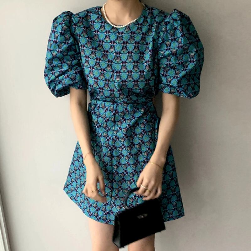 サマースタンダードラウンドネックウェストギャザーレーススリーブFlowerデザイン カラープリント柄ドレス レトロ 夏物 Oネック フラワーデザイン 7/20 mi463524279858