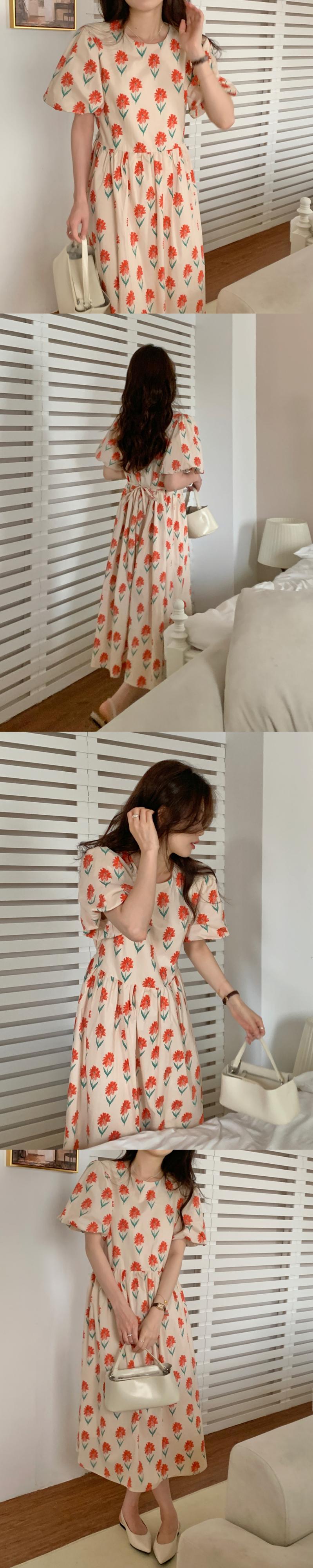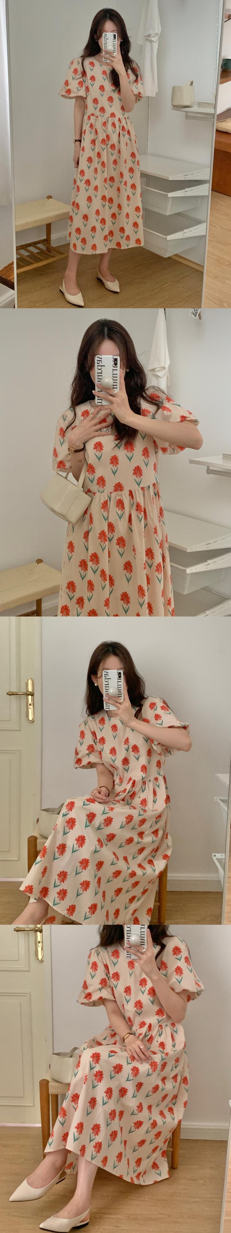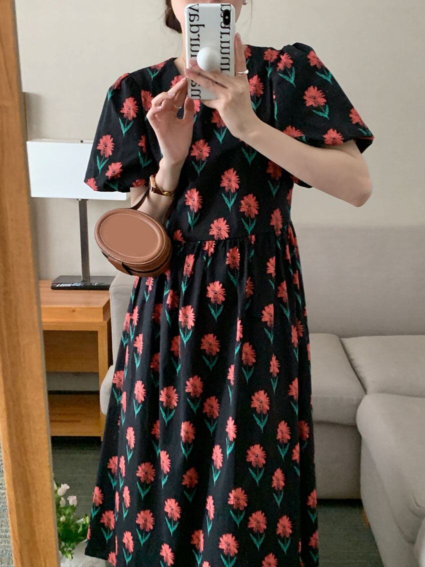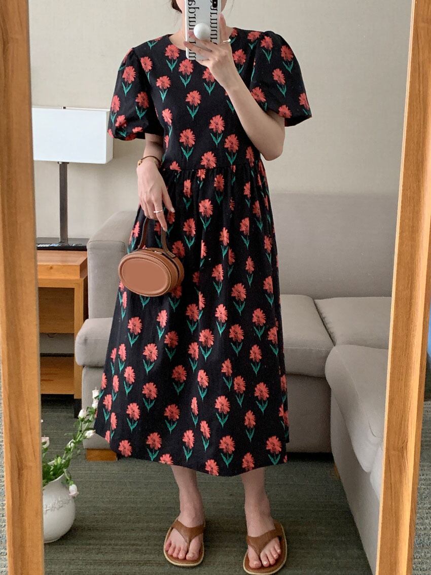 サマーラウンドネックプリーツウェスト薄手プリントドレス ロングスカート エレガント 夏物 Oネック 7/20 mi4619783095916