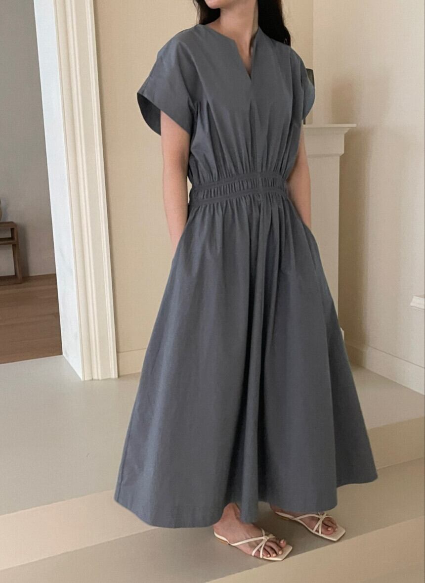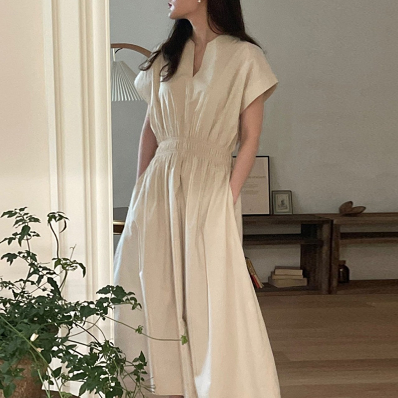サマーVネックプリーツウェストポケットスリーブAラインドレス 夏物 7/20 mi4697959914395
