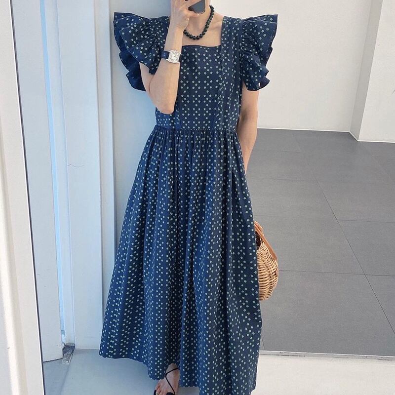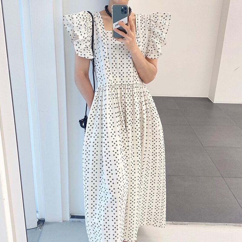 サマープリーツウェストフローラルドレス エレガント 夏物 花柄 スクウェア ステッチ 7/20 mi4689680927424