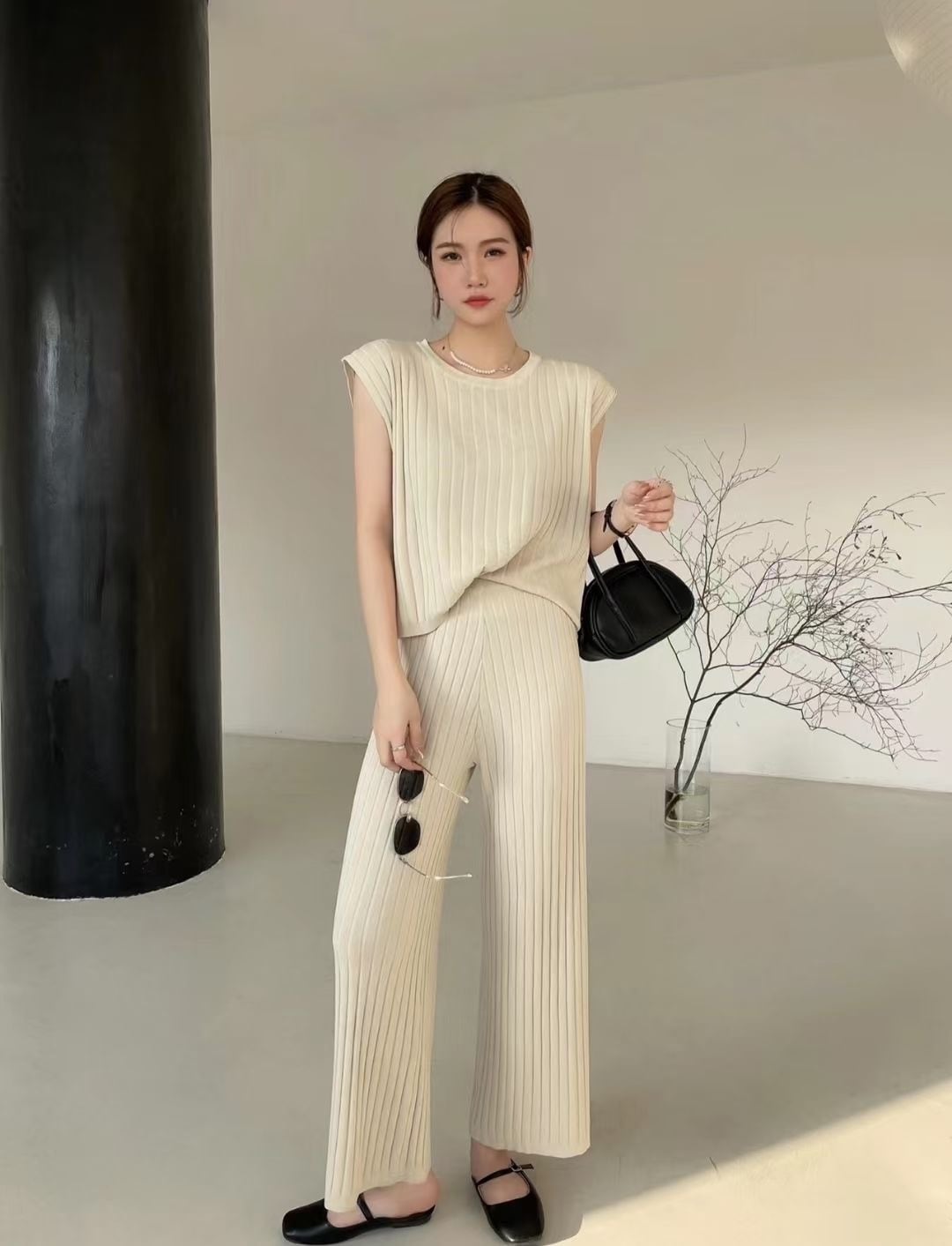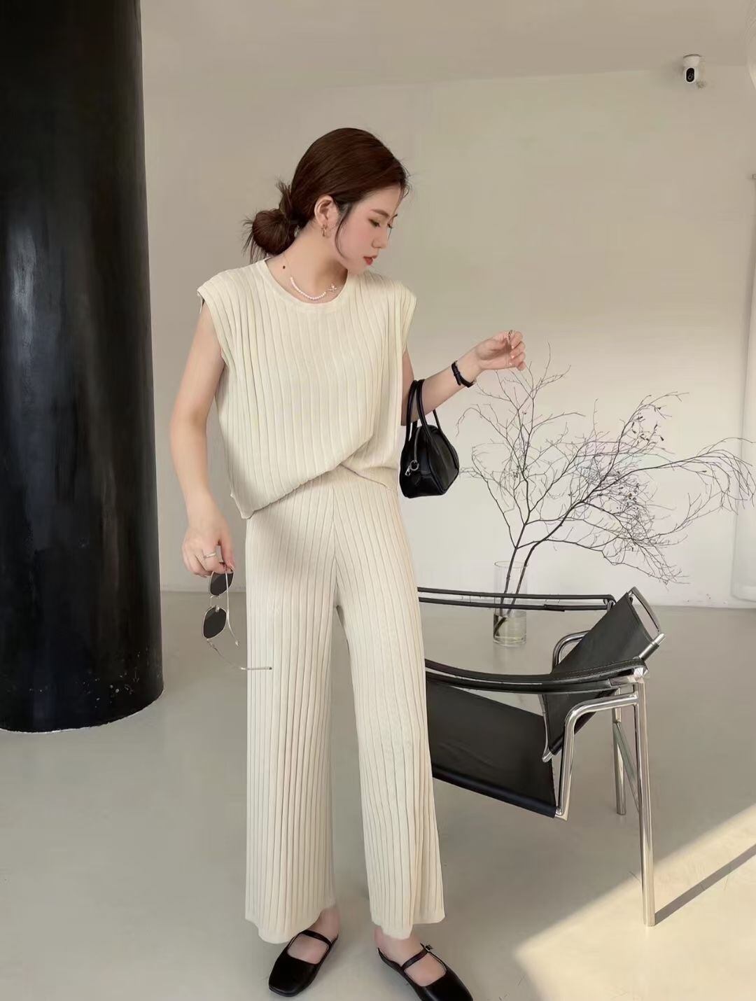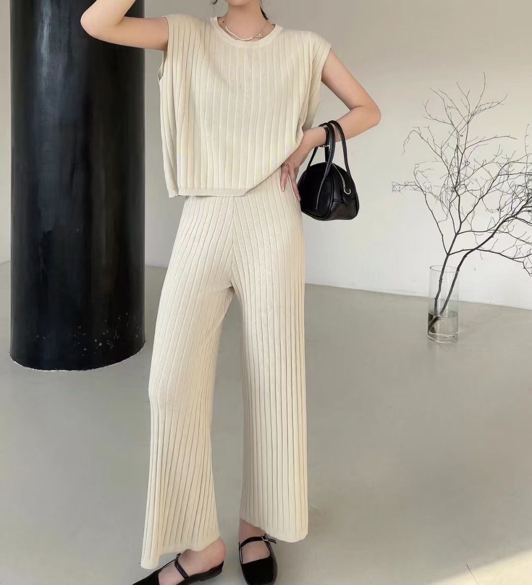 サマーラウンドネックストライプニットセーター ハイウェストウェストワイドレッグカジュアルパンツ 夏物 Oネック ワイドパンツ 7/20 mi4641548401794