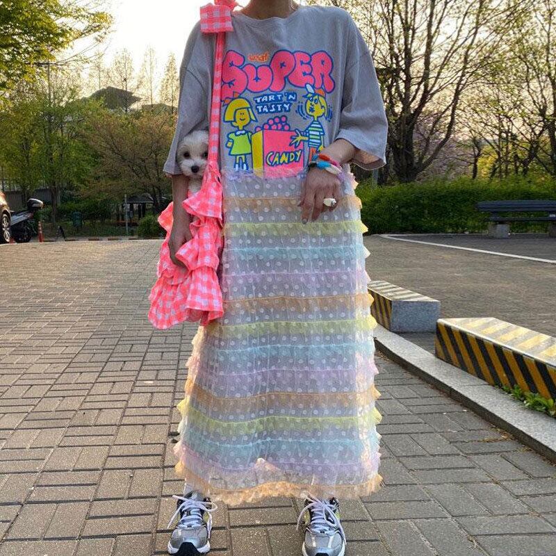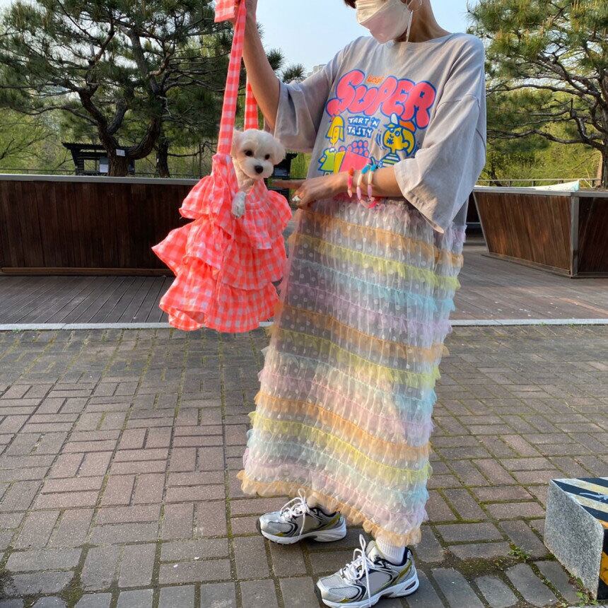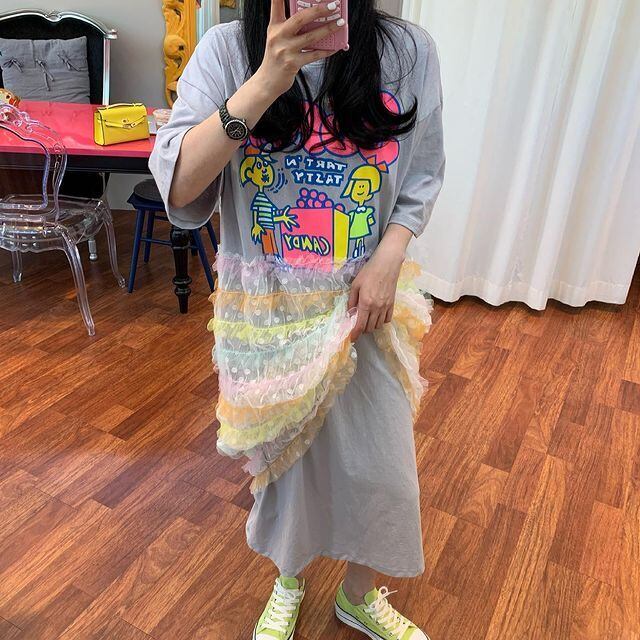 サマーラウンドネックプリントカラーメッシュドレス レッド 夏物 Oネック ステッチ 7/20 mi4615116130239