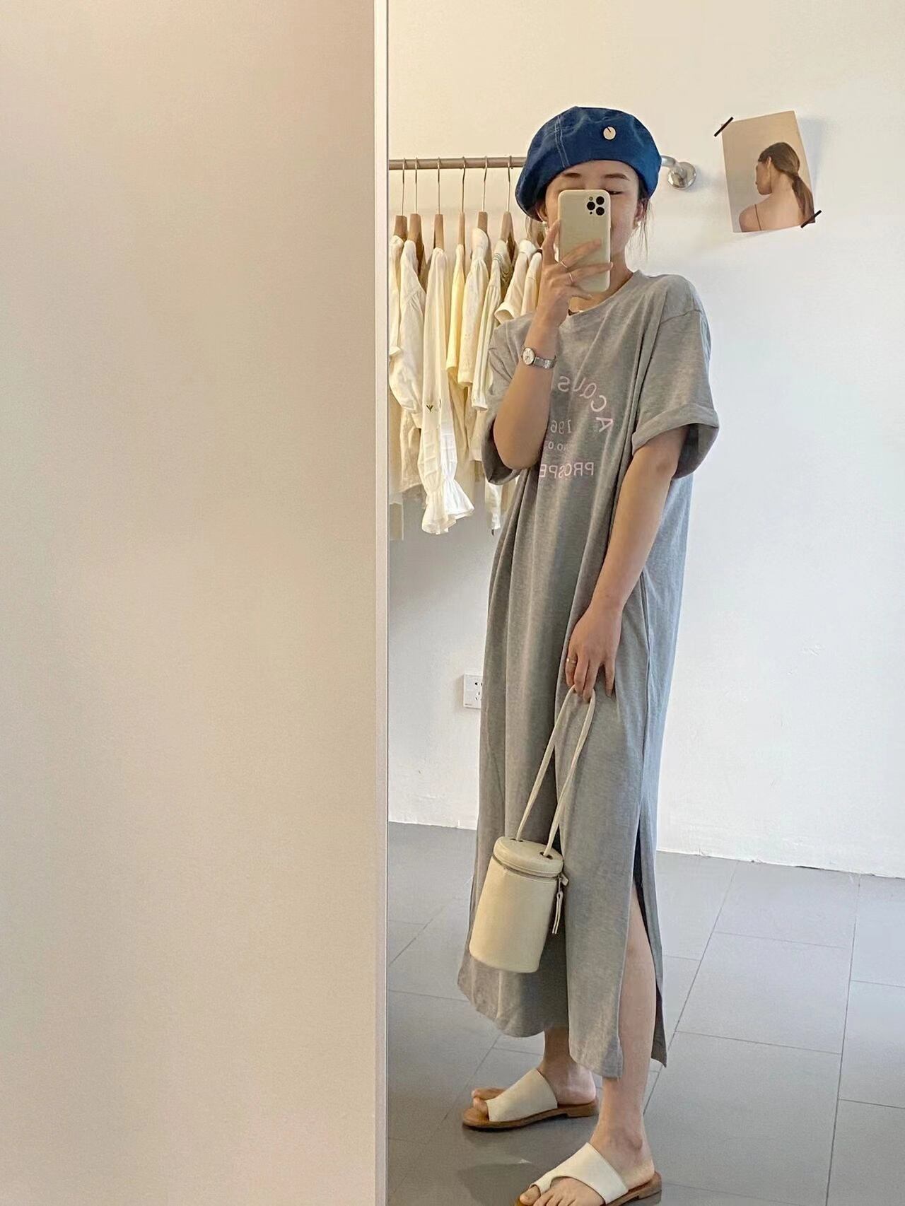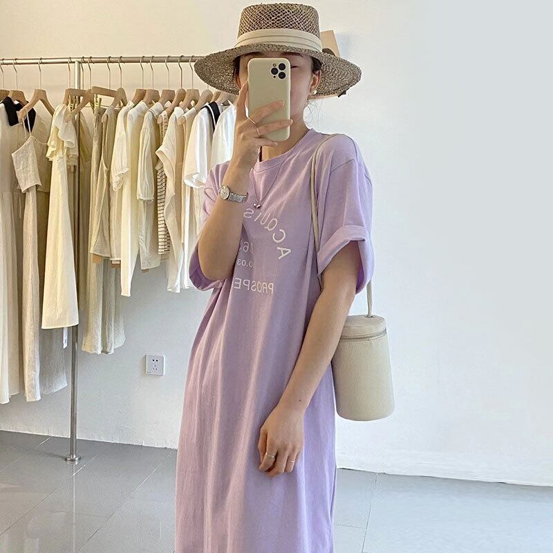 サマーカジュアルラウンドネックプリントルーズサイドスリットTシャツ ドレス レディース 夏物 Oネック 7/20 mi465023052861