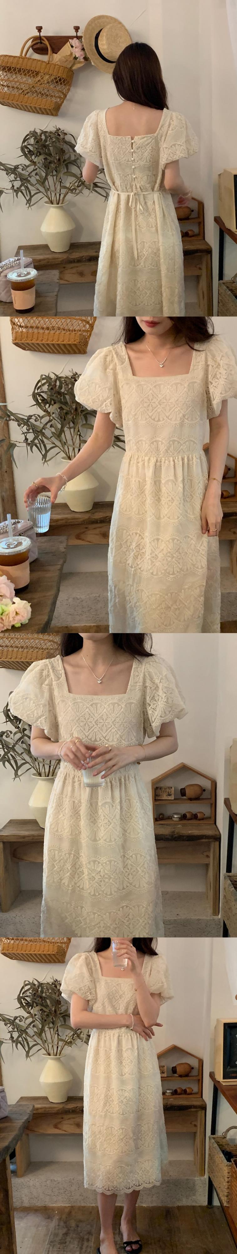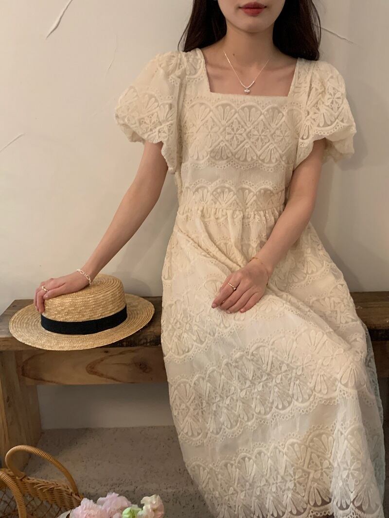 サマーカラーレースFlowerデザイン ウェストスリーブドレス 夏物 フラワーデザイン スクウェア 7/20 mi4625715538785