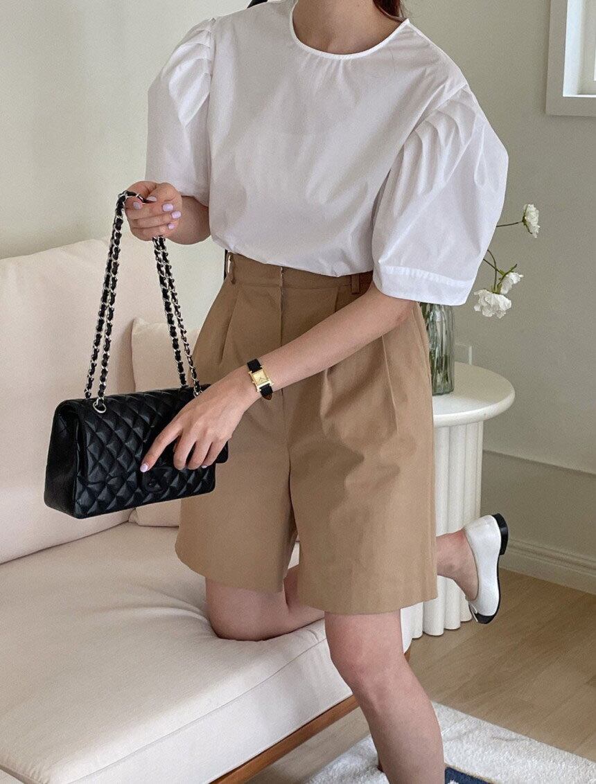 サマーラウンドネックバックルーズカジュアルプリーツスリーブシャツ トップス レディース 夏物 Oネック 7/20 mi463477245248