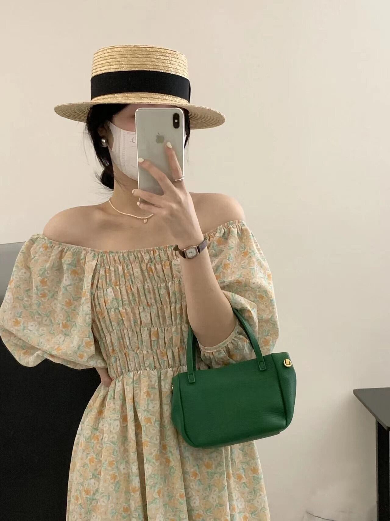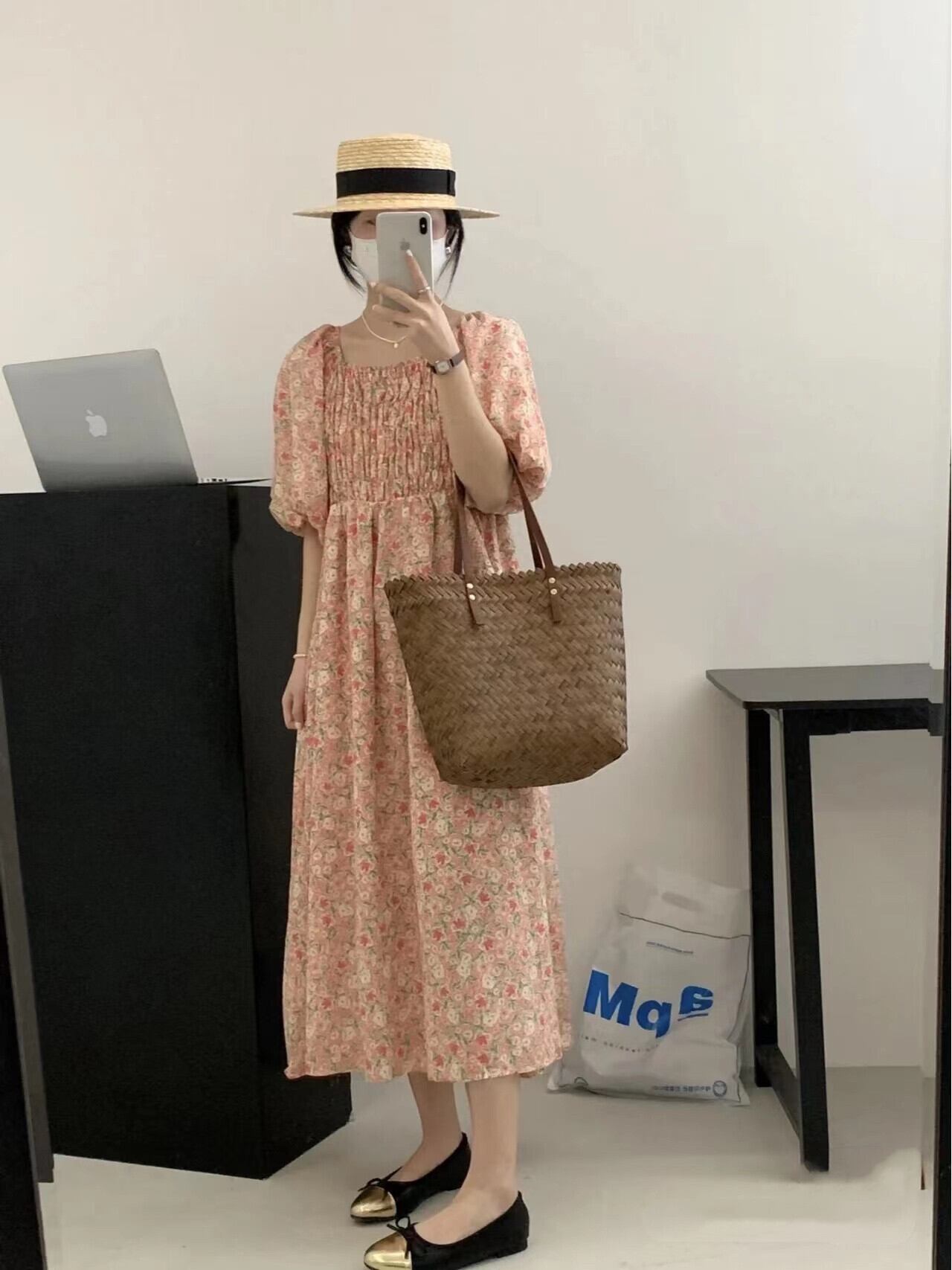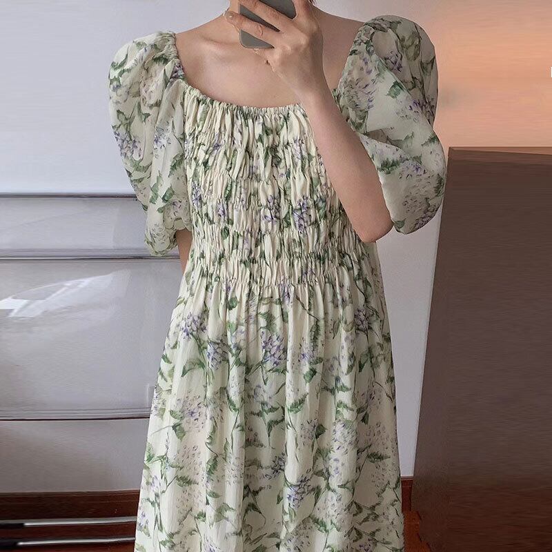 サマースタンダードカラーウェストスリムスリーブフローラルドレス レトロ エレガント 夏物 花柄 スクウェア 7/20 mi4686803763444